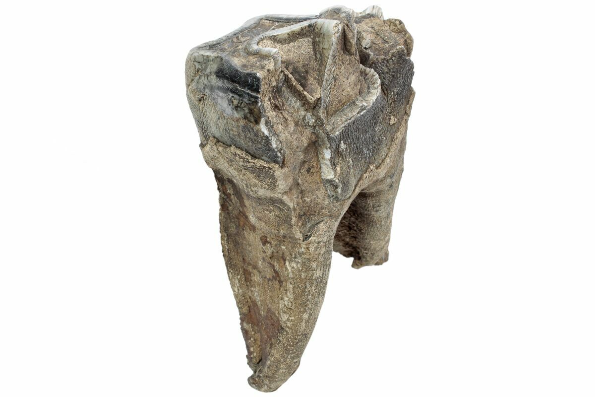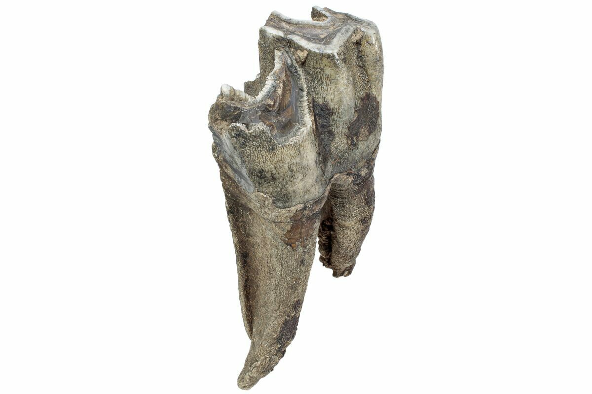 This is a well preserved fossil tooth from a woolly rhinoceros (Coelodonta antiquitatis). The enamel is very well preserved, with brown-gray tones coating most of the crown. This fossil comes from Siberia, Russia, where many Woolly Mammoth and Rhino fossils are unearthed. The tooth is mostly complete and has most of its root intact. Including the root, the tooth measures 4.2" tall. A portion of the crown is missing, hence the reduced price.