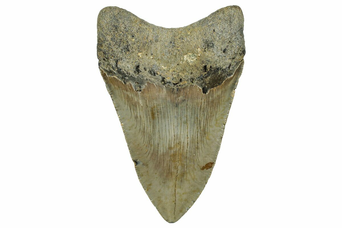 This is a 4.21" long megalodon tooth collected on the North Carolina coast. It was found by commercial divers collecting "the ledges" in about 100 feet of water. It would have eroded out of the Pungo River Formation, putting its age in the range of 13.8 to 16 million years old. A tooth of this size would have come from a prehistoric, mega-shark in the 35+ foot size range.