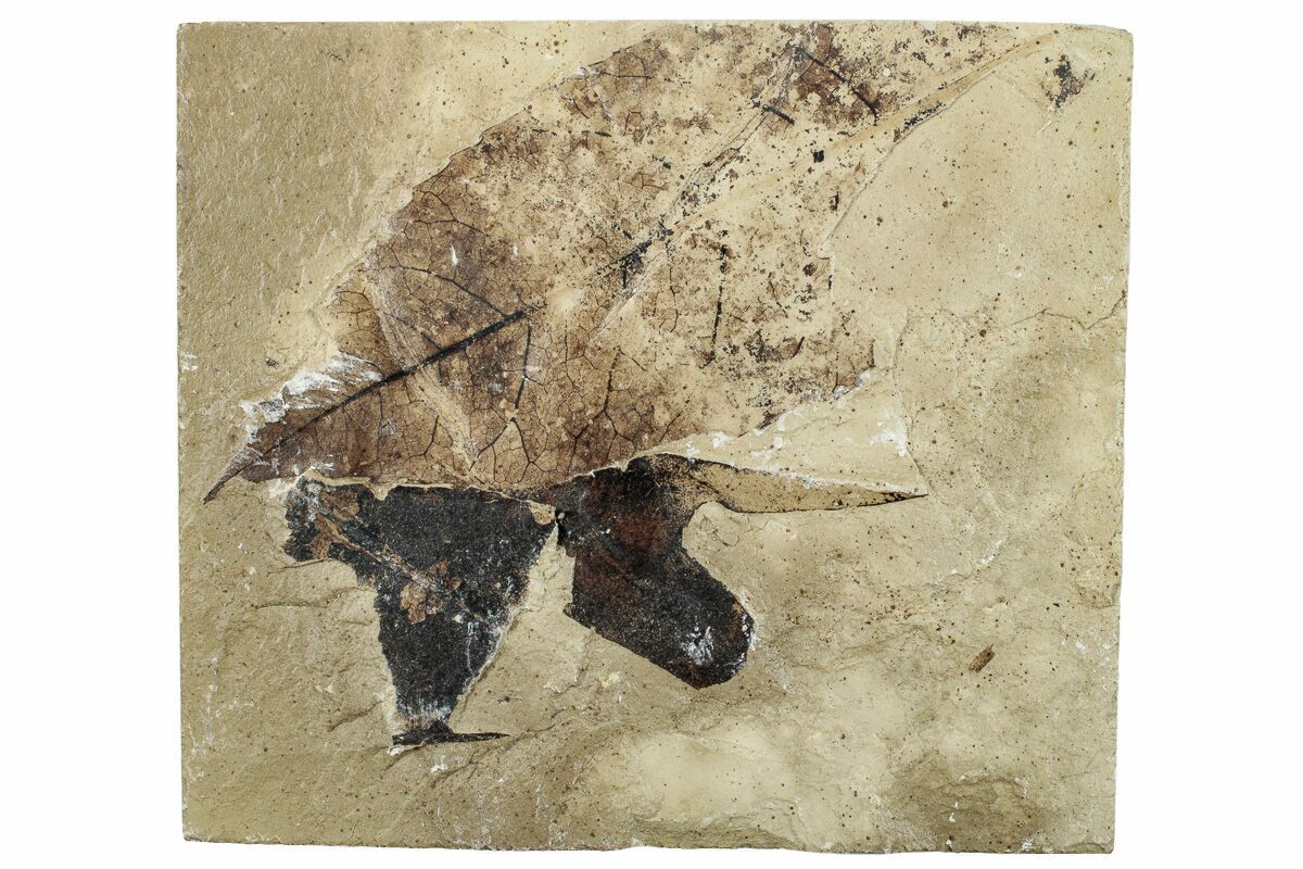 This is an interesting fossil leaf plate from the Green River Formation, Utah. It contains two dark, well-preserved unidentified leaves: a larger, paler leaf (4.35") and a smaller, darker one (2.9"), likely a leaf fragment of the genus Macginitiea.