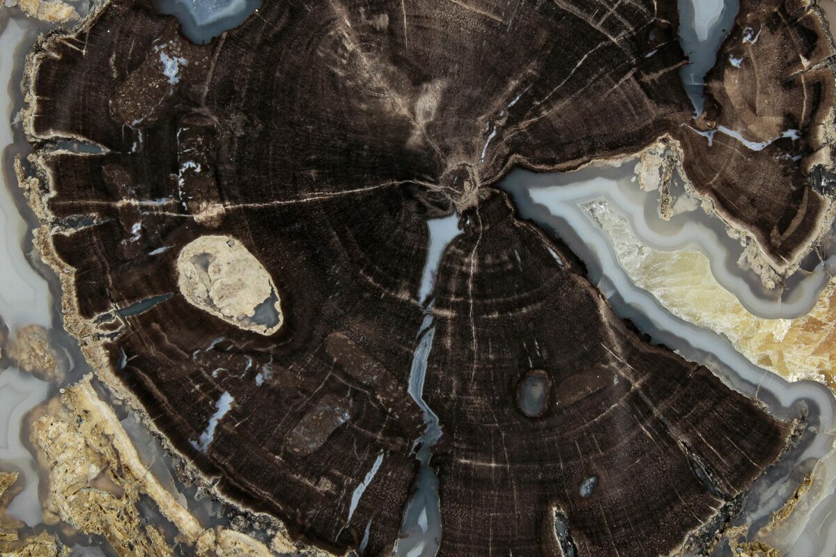 This petrified wood was formed when trees died and fell into a swamp where they were rapidly covered by algae. This formed casts that preserved the original bark surfaces and kept the trees from decaying. Eventually the algae casts and the spaces between them were filled in by minerals, often in exquisite crystalline form. These casts have preserved incredibly fine details in the wood, providing researchers with a wealth of information about these ancient trees. A paper on the formation of this petrified wood can be found at the link below.
