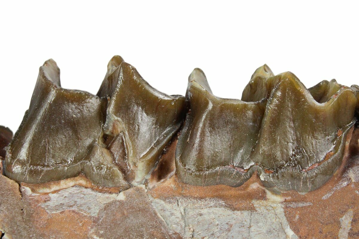 This is a 4.25" long mandible section from the right side of the jaw of a sub-adult running rhino (Hyracodon nebraskensis). It was collected from the the Brule Formation in South Dakota and would be approximately 30-33 million years old. There are three complete preserved teeth still embedded in the jaw.