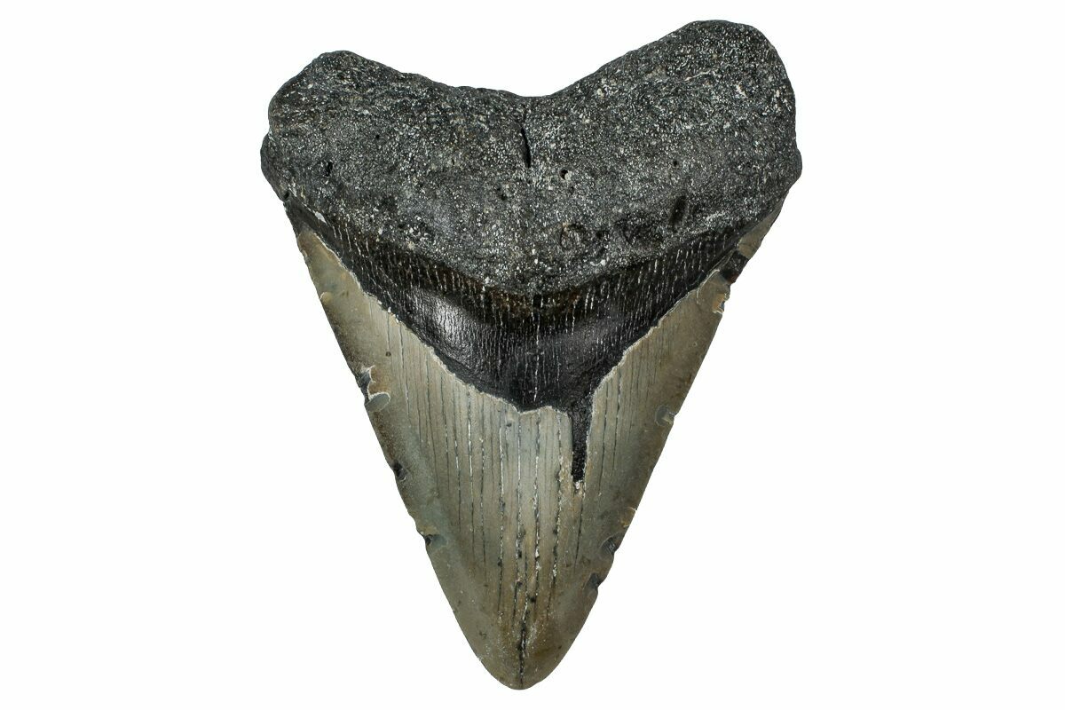 This is a 4.28" long megalodon tooth collected on the North Carolina coast. It was found by commercial divers collecting "the ledges" in about 100 feet of water. It would have eroded out of the Pungo River Formation, putting its age in the range of 13.8 to 16 million years old. A tooth of this size would have come from a prehistoric, mega-shark in the 35+ foot size range.
