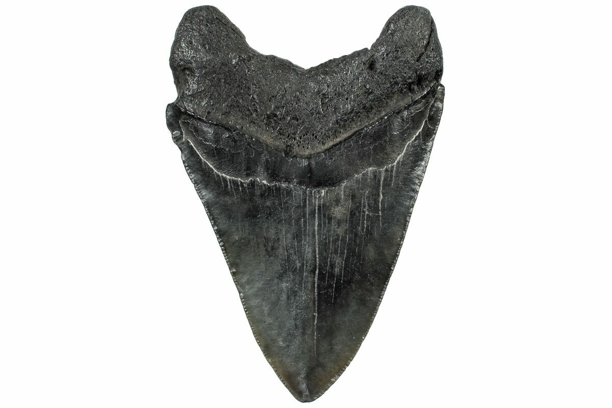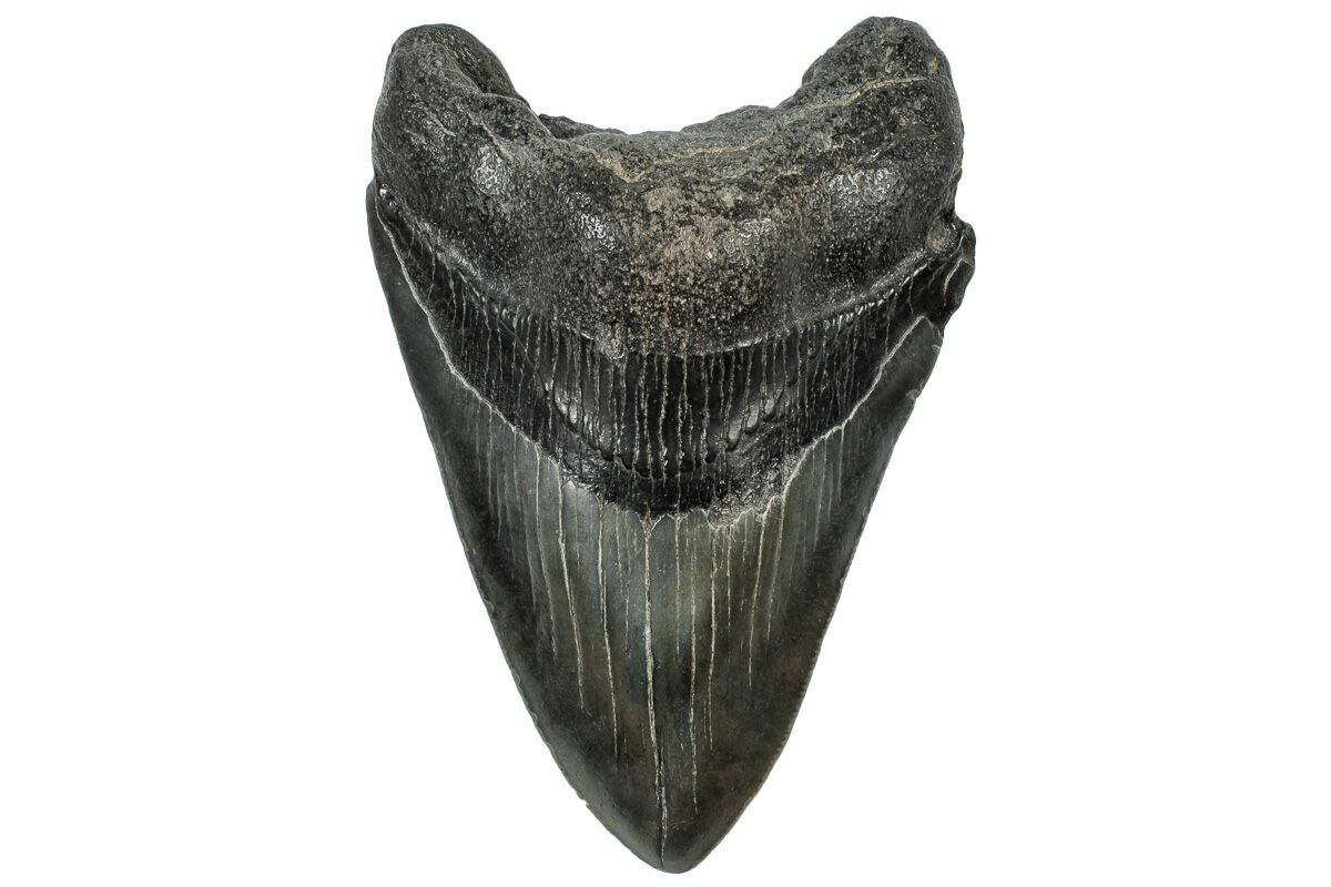 This is a 4.28" long fossil megalodon tooth collected in South Carolina. The tooth would have come from an adult, prehistoric, mega-shark in the 35+ foot size range.