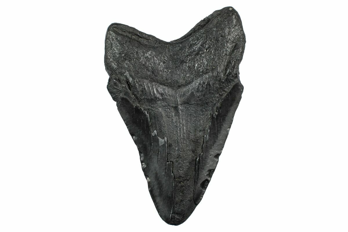 The standard measure for megalodon teeth is slant height, or the longest edge of the tooth. Adult megalodon teeth were typically in the 4 to 5 inch range: teeth over 6 inches are rare and represent super-sized individuals. Only a handful of teeth have ever been found over seven inches.