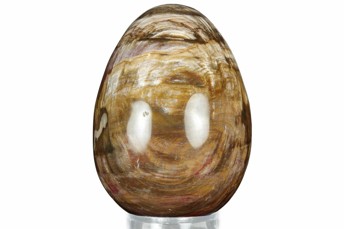 This is a colorful, 4.3" tall polished egg made from petrified wood from Ambilobe, Madagascar. The petrified wood comes from the Araucaria tree, a type of extinct conifer from the early Triassic period, or approximately 220 million years old, close to the time the first dinosaurs appeared on the planet.