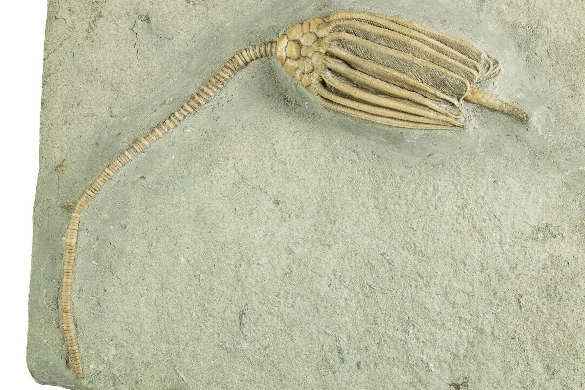 This is a gorgeous 4.3" long (including stem) Macrocrinus mundulus crinoid from the famous crinoid beds near Crawfordsville, Indiana. The quality of preparation on this fossil is exquisite, using skillful air-abrasion techniques under a stereo microscope.