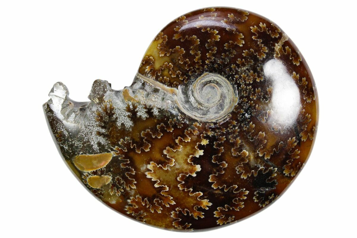 This is a 4.3" wide polished ammonite of the genus Cleoniceras, collected in Madagascar. It is absolutely gorgeous, displaying a distinctive "oak-leaf" suture pattern on the surface. This 110 million year old ammonite is truly a natural work of art, with the end chamber having been exposed/cleaned.