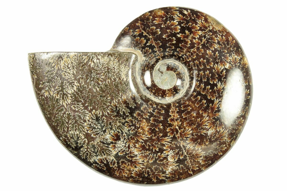 This is a 4.3" wide polished ammonite from Madagascar of the genus Cleoniceras. It is absolutely gorgeous, displaying a distinctive "oak-leaf" suture pattern on the surface. This 110 million year old ammonite is truly a natural work of art and is very displayable on the included acrylic stand.