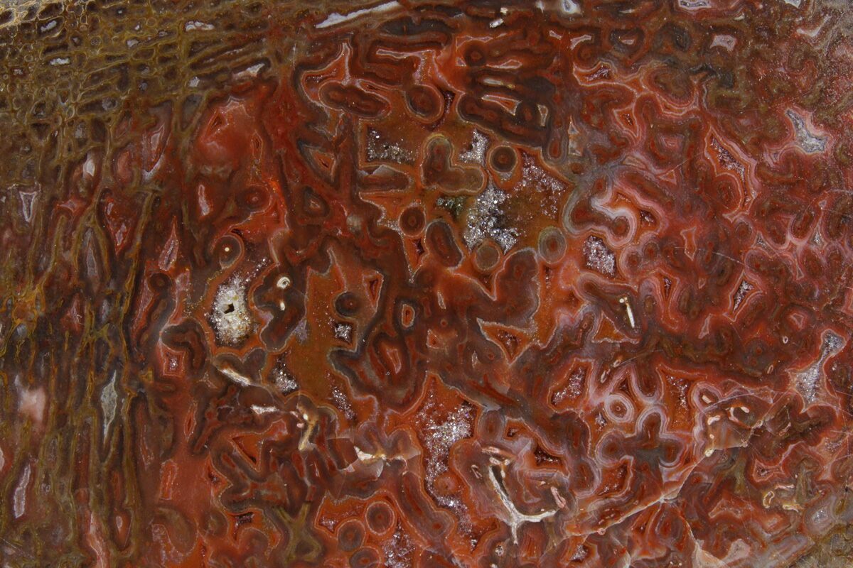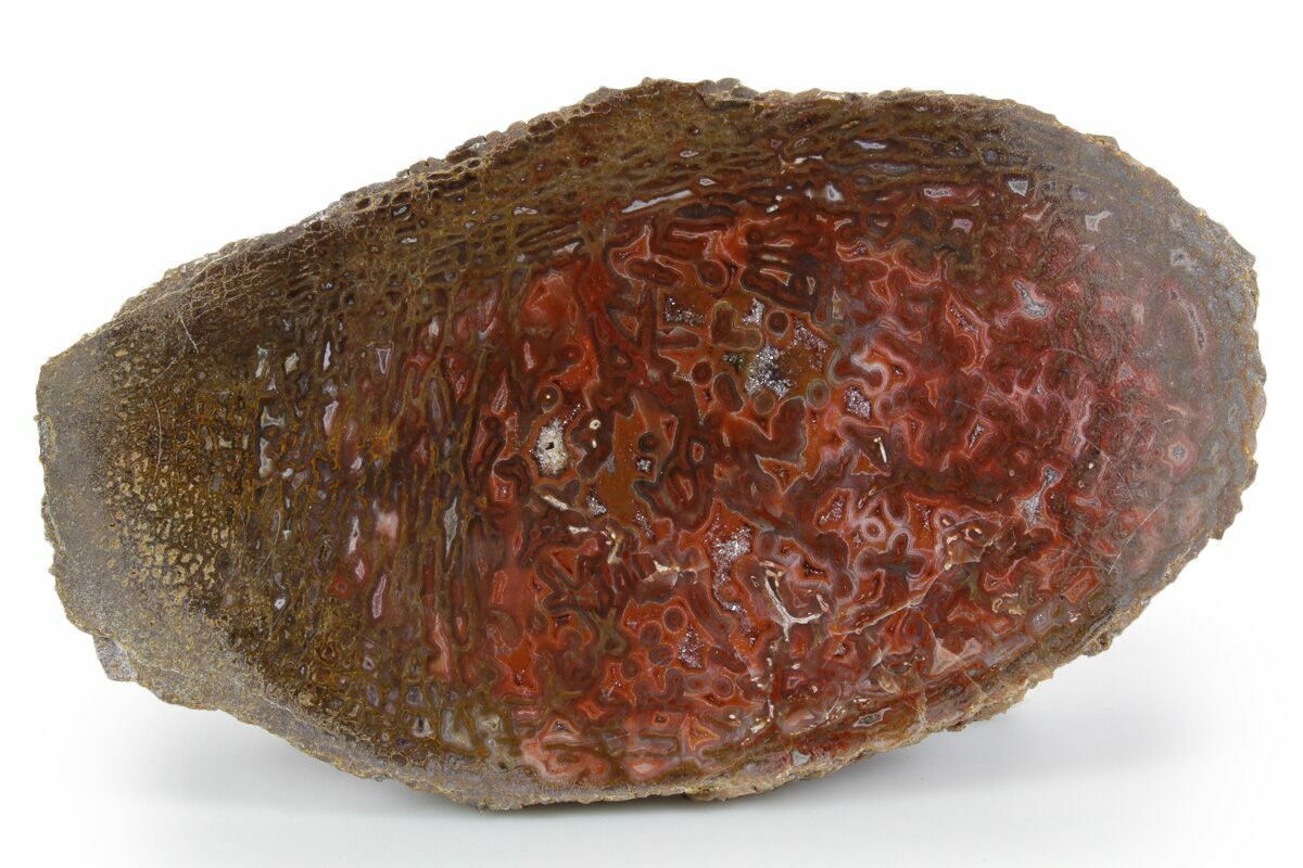 This is a very vibrant, 4.3" wide slab of polished agatized dinosaur bone (gembone) from the Morrison Formation in New Mexico. Gorgeous bright red to pink colored cells on this specimen. It is cut flat on both sides and polished to a glossy finish on one.
