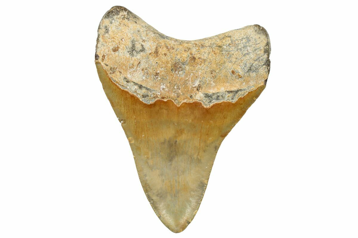 This is a 4.31" long megalodon tooth collected on the North Carolina coast. It was found by commercial divers collecting "the ledges" in about 100 feet of water. It would have eroded out of the Pungo River Formation, putting its age in the range of 13.8 to 16 million years old. A tooth of this size would have come from a prehistoric, mega-shark in the 35+ foot size range.