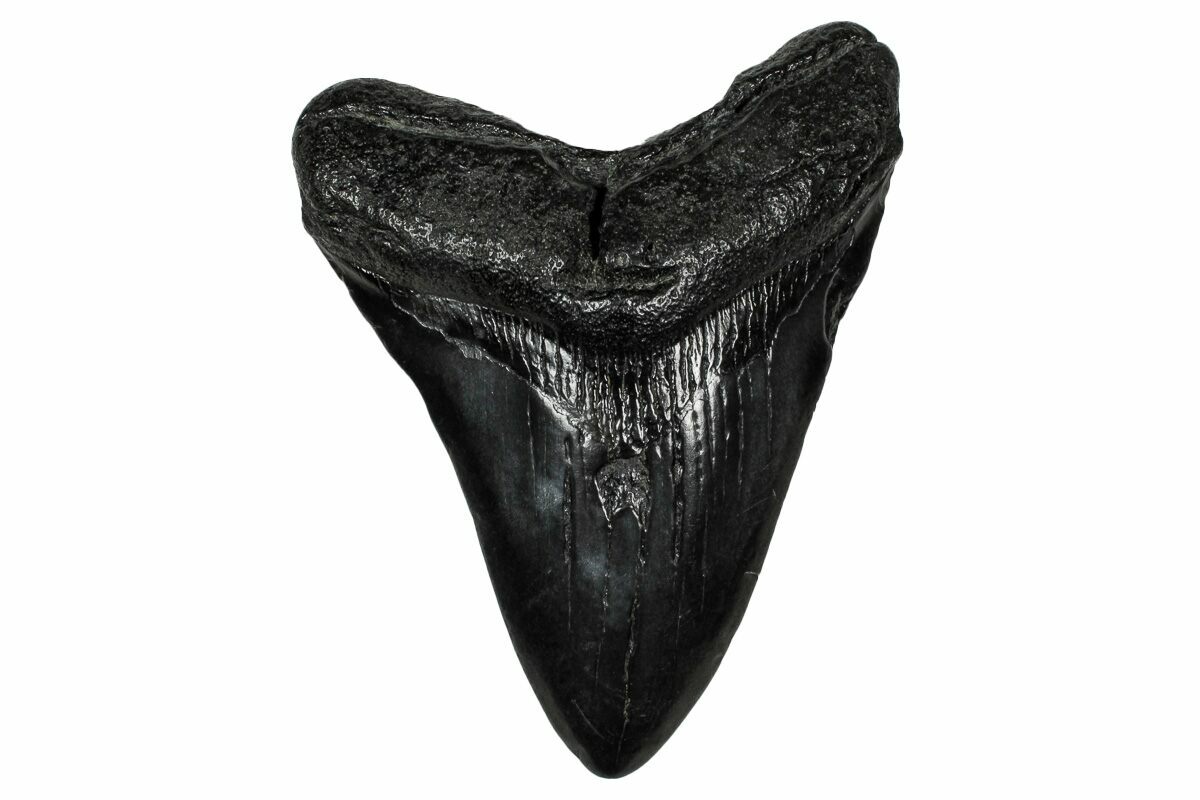 This is a 4.31" long, fossil megalodon tooth collected in South Carolina. The tooth would have come from an adult, prehistoric, mega-shark in the 35+ foot size range.