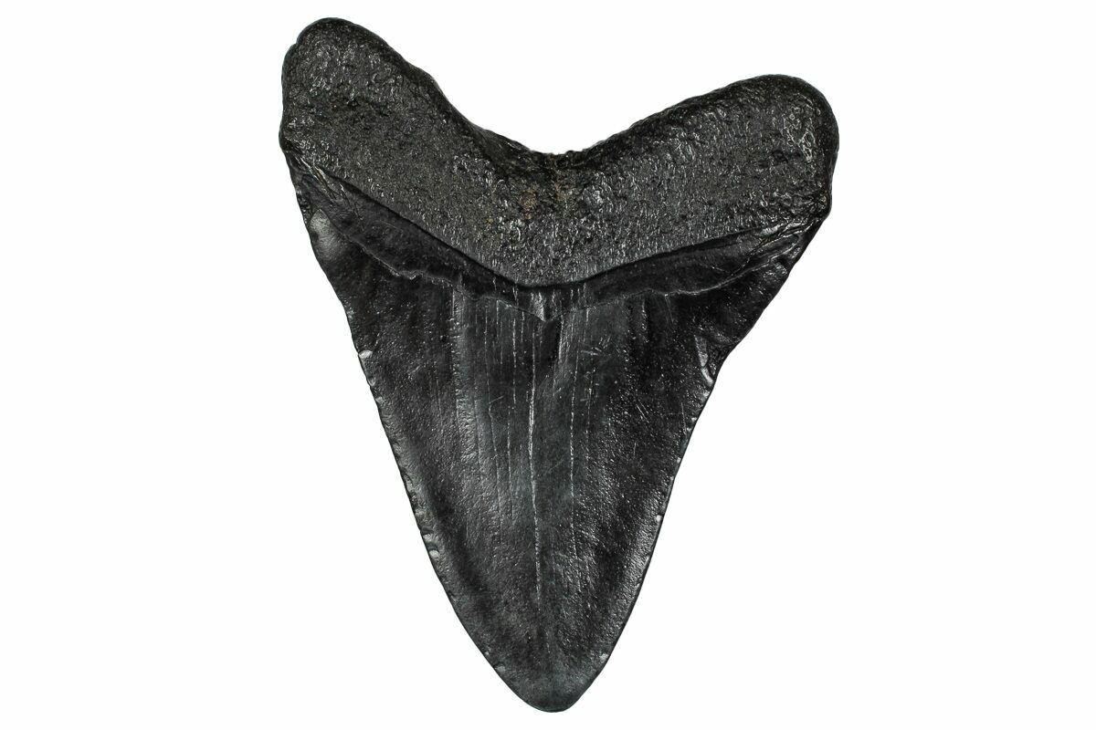 The standard measure for megalodon teeth is slant height, or the longest edge of the tooth. Adult megalodon teeth were typically in the 4 to 5 inch range: teeth over 6 inches are rare and represent super-sized individuals. Only a handful of teeth have ever been found over seven inches.