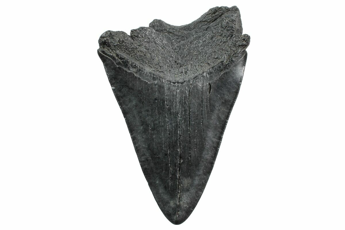 The standard measure for megalodon teeth is slant height, or the longest edge of the tooth. Adult megalodon teeth were typically in the 4 to 5 inch range: teeth over 6 inches are rare and represent super-sized individuals. Only a handful of teeth have ever been found over seven inches.