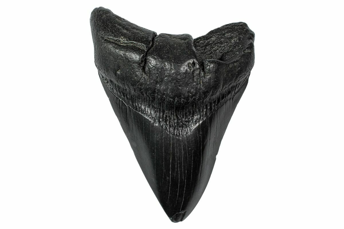 This is a 4.34" long, fossil megalodon tooth collected in South Carolina. The tooth would have come from an adult, prehistoric, mega-shark in the 35+ foot size range. The serrations are worn, but many are still visible.