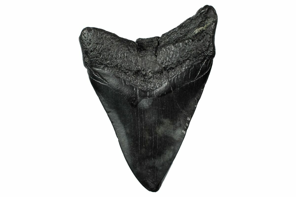 The standard measure for megalodon teeth is slant height, or the longest edge of the tooth. Adult megalodon teeth were typically in the 4 to 5 inch range: teeth over 6 inches are rare and represent super-sized individuals. Only a handful of teeth have ever been found over seven inches.