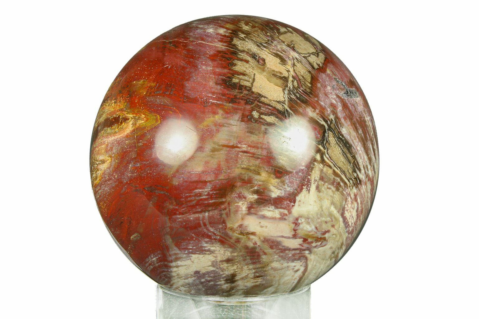 This is a colorful, 4.35" wide, polished sphere of petrified wood from Ambilobe, Madagascar. It is from the Araucaria tree, a type of conifer. The petrified wood is from the early Triassic period, approximately 220 million years old, close to the time the first dinosaurs appeared on the planet.