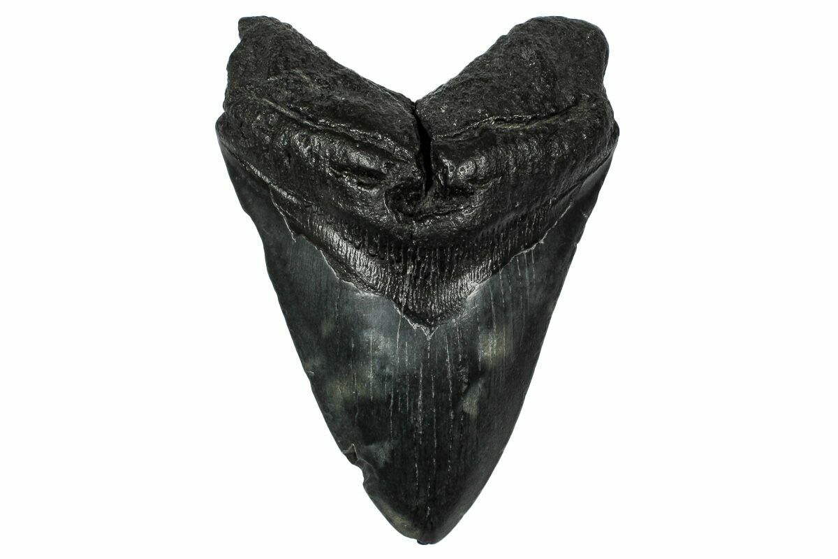 This is a 4.35" long, fossil megalodon tooth collected in South Carolina. The tooth would have come from an adult, prehistoric, mega-shark in the 35+ foot size range.