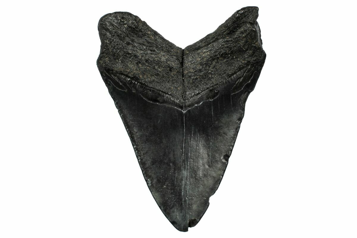 The standard measure for megalodon teeth is slant height, or the longest edge of the tooth. Adult megalodon teeth were typically in the 4 to 5 inch range: teeth over 6 inches are rare and represent super-sized individuals. Only a handful of teeth have ever been found over seven inches.