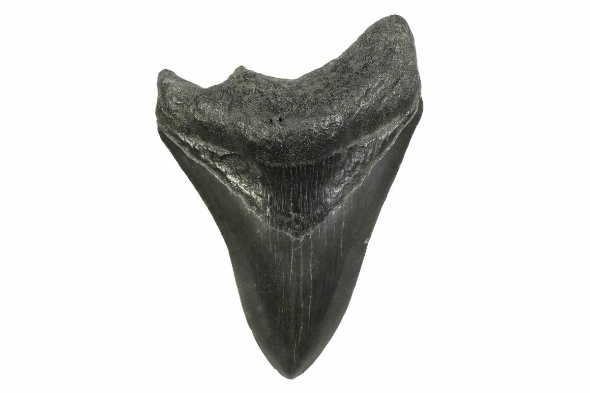 The standard measure for megalodon teeth is slant height, or the longest edge of the tooth. Adult megalodon teeth were typically in the 4 to 5 inch range: teeth over 6 inches are rare and represent super-sized individuals. Only a handful of teeth have ever been found over seven inches.