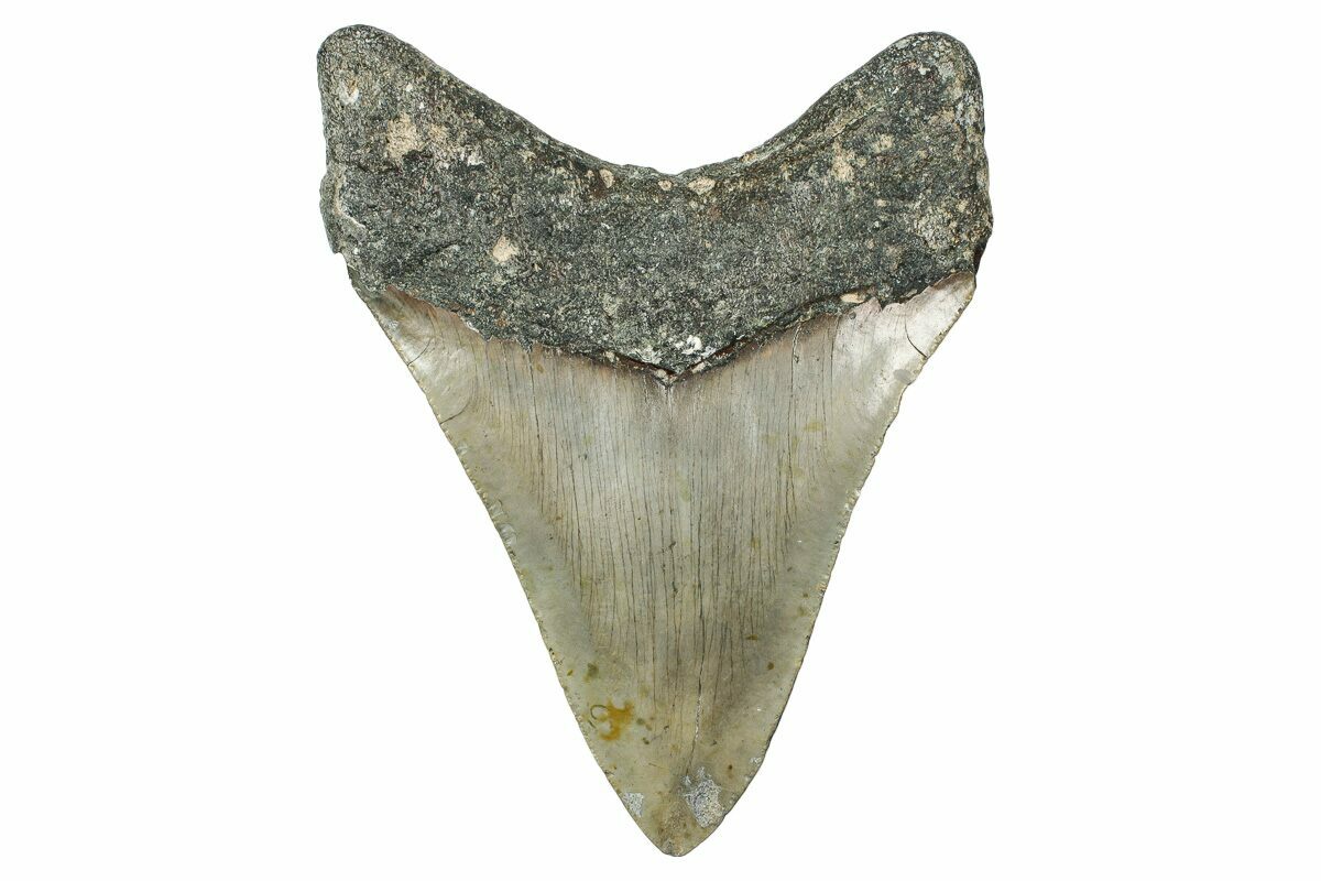 The standard measure for megalodon teeth is slant height, or the longest edge of the tooth. Adult megalodon teeth were typically in the 4 to 5 inch range: teeth over 6 inches are rare and represent super-sized individuals. Only a handful of teeth have ever been found over seven inches.