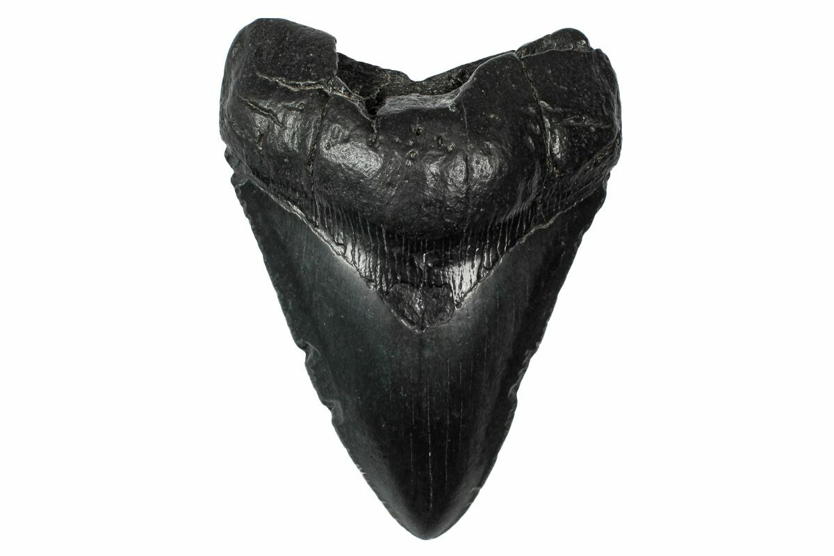 This is a 4.38" long, fossil megalodon tooth collected in South Carolina. The tooth would have come from an adult, prehistoric, mega-shark in the 35+ foot size range. The serrations are worn, but many are still visible.