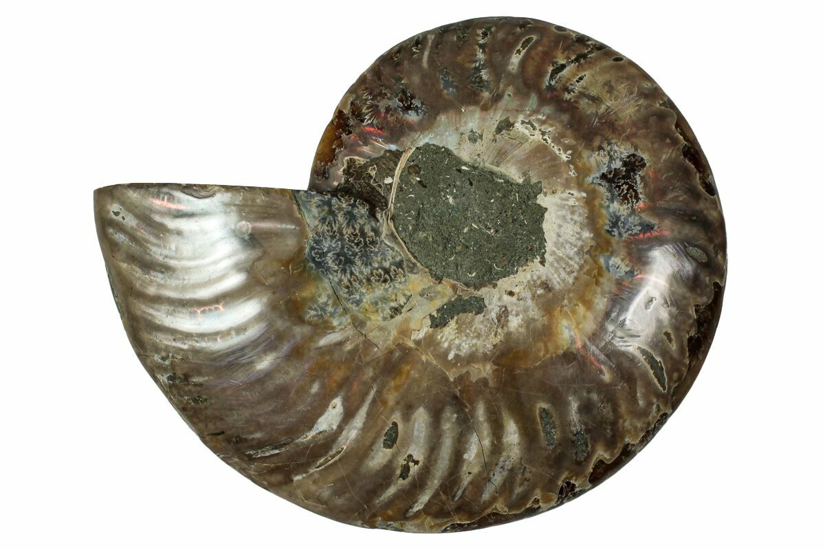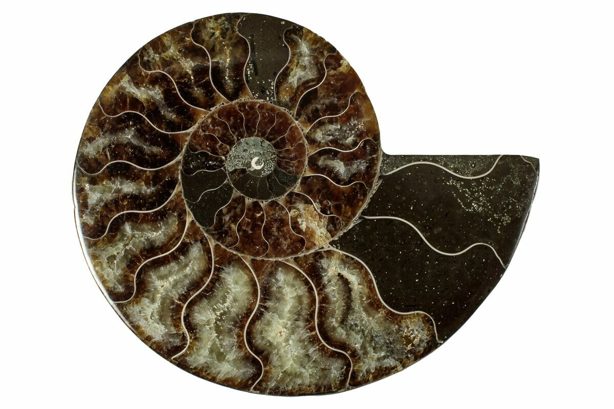 Here is a beautiful, 4.4" wide, cut and polished Cleoniceras ammonite fossil from Madagascar. These ammonites are Cretaceous in age, approximately 110 million years old. This specimen exhibits gorgeous mineralization within the chambers, each separated by white calcite septa (divisions). This highly polished, exotic ammonite makes a superb display piece with tremendous historical appeal.