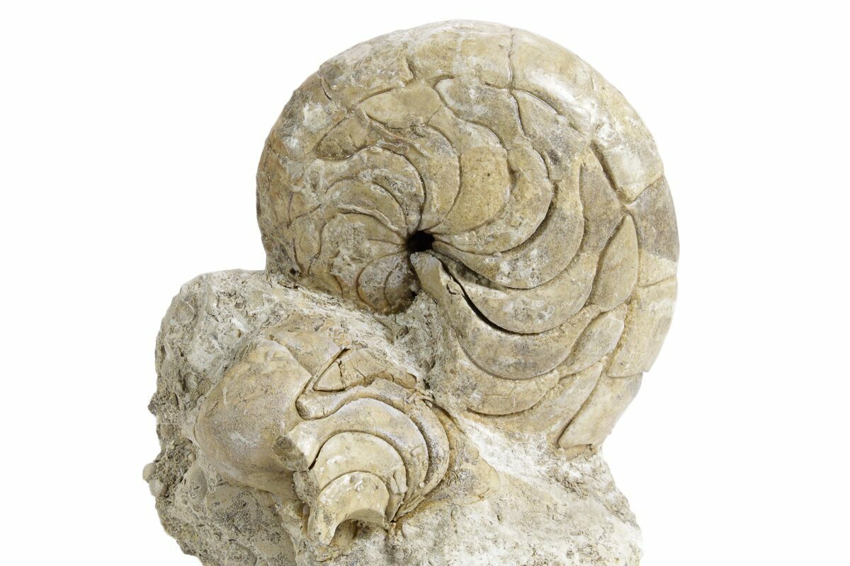 There is substantial stabilization and repair work as these nautiloids are in a softer matrix and are very delicate. There is still some rock attached to the fossil and it has been cut flat so the piece stands up nicely on a hard surface without the need for a display stand.