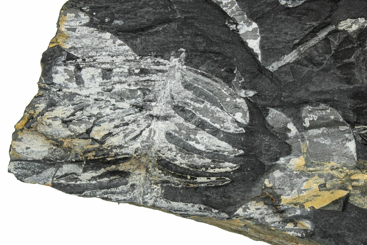 This is a 4.4" wide plate of fossil seed ferns from the Pennsylvanian aged (305 million year) Llewellyn formation of Pennsylvania. The white and orange color of these detailed fern fossils contrasts well against the black shale they are preserved in. There are fossils on both sides of the specimen. These St. Clair fern plates used to be quite common but access to the locality is now restricted so there is not a lot of material left on the market.