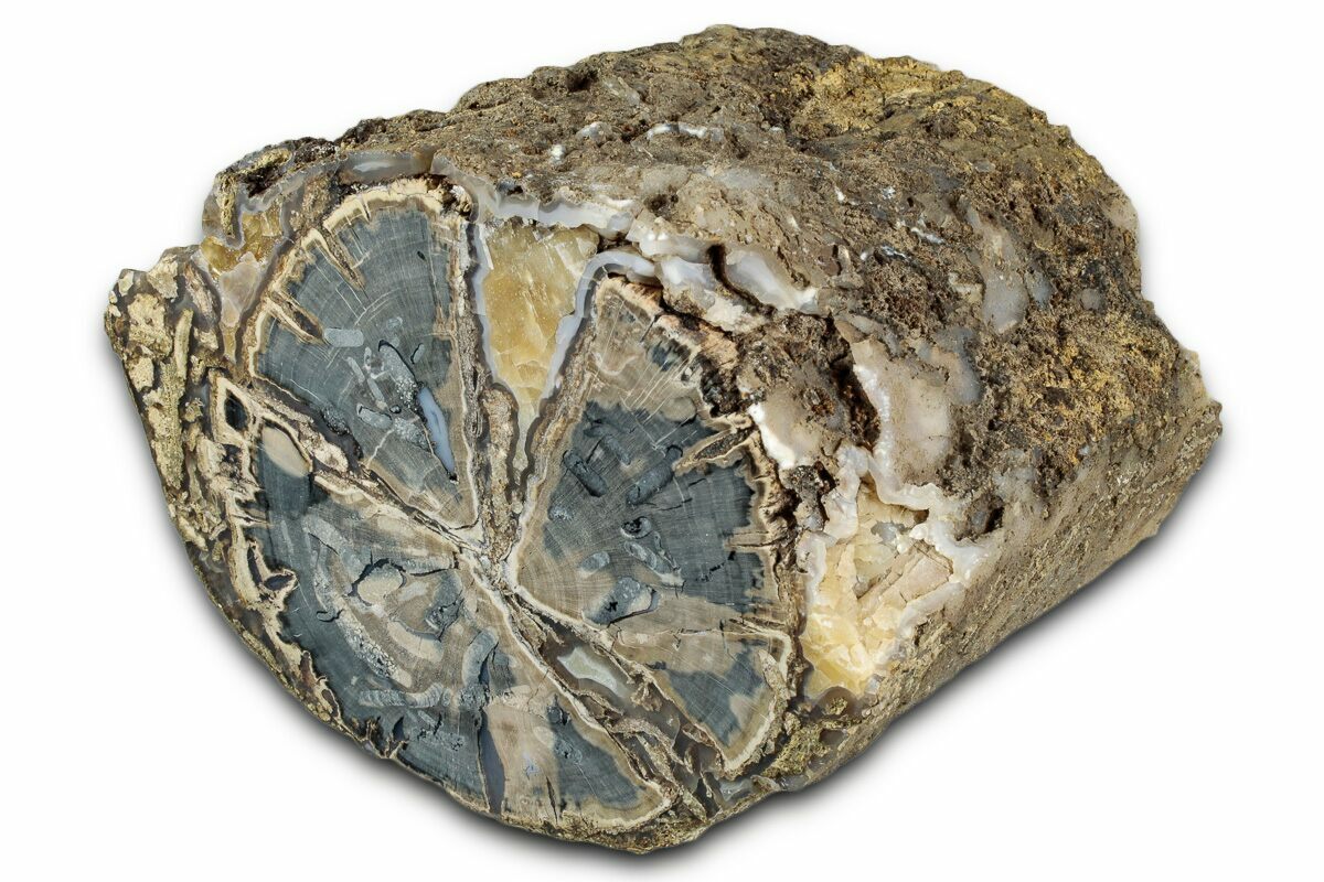This petrified wood was formed when trees died and fell into a swamp where they were rapidly covered by algae. This formed casts that preserved the original bark surfaces and kept the trees from decaying. Eventually the algae casts and the spaces between them were filled in by minerals, often in exquisite crystalline form. These casts have preserved incredibly fine details in the wood, providing researchers with a wealth of information about these ancient trees. A paper on the formation of this petrified wood can be found at the link below.