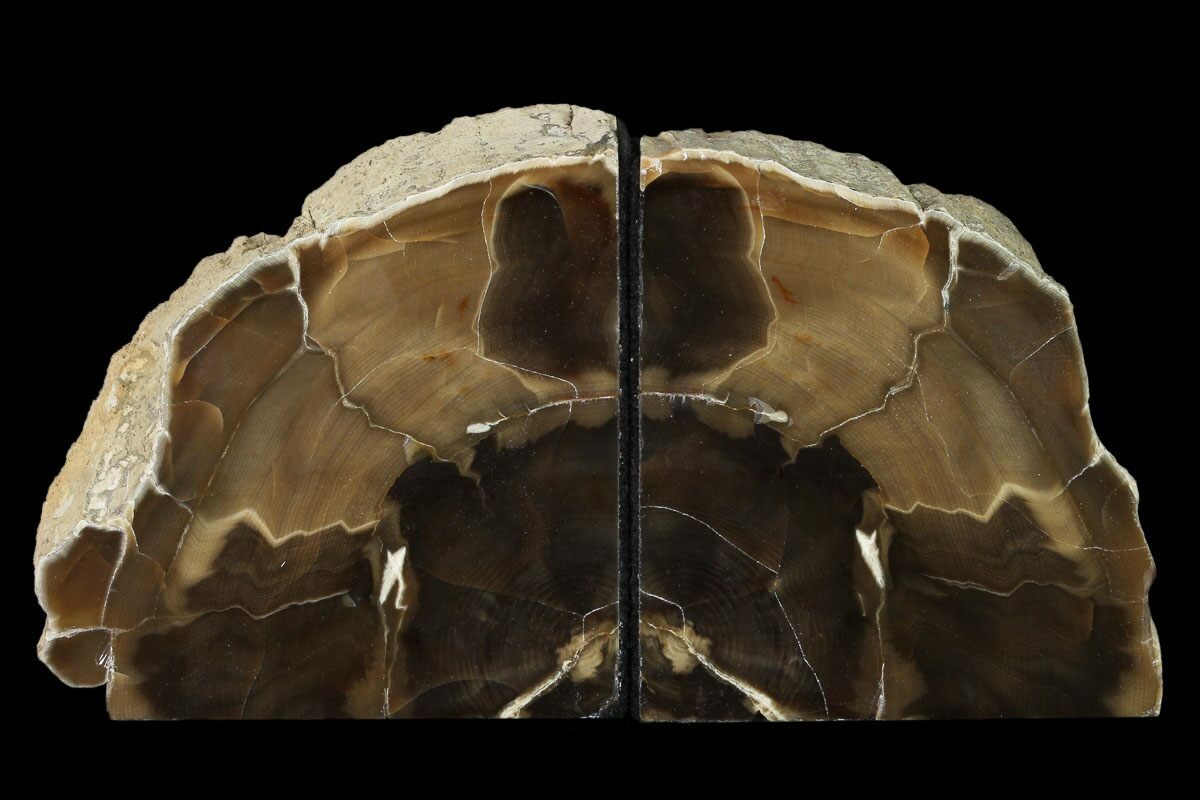 This is a pair of bookends made from petrified wood from McDermitt, Oregon. The bookends have been polished on the outer face to highlight the details. The flat edges have been lined with felt.