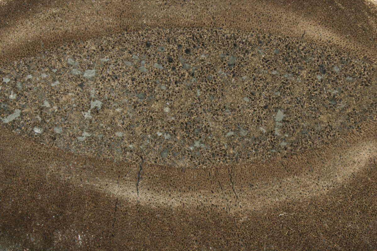 This is a 4.4" wide slice of polished limb bone from the pliosaur, Liopleurodon sp.. This genus of pliosaur has gained much notoriety and received the nickname "Predator X". The bone comes from the Middle Jurassic (160 million year old) Oxford Clay of England. Fragmentary bones are a fairly common occurrence in the clays of this formation and this one has been cut and polished on one side to reveal the beautifully preserved cell structure.