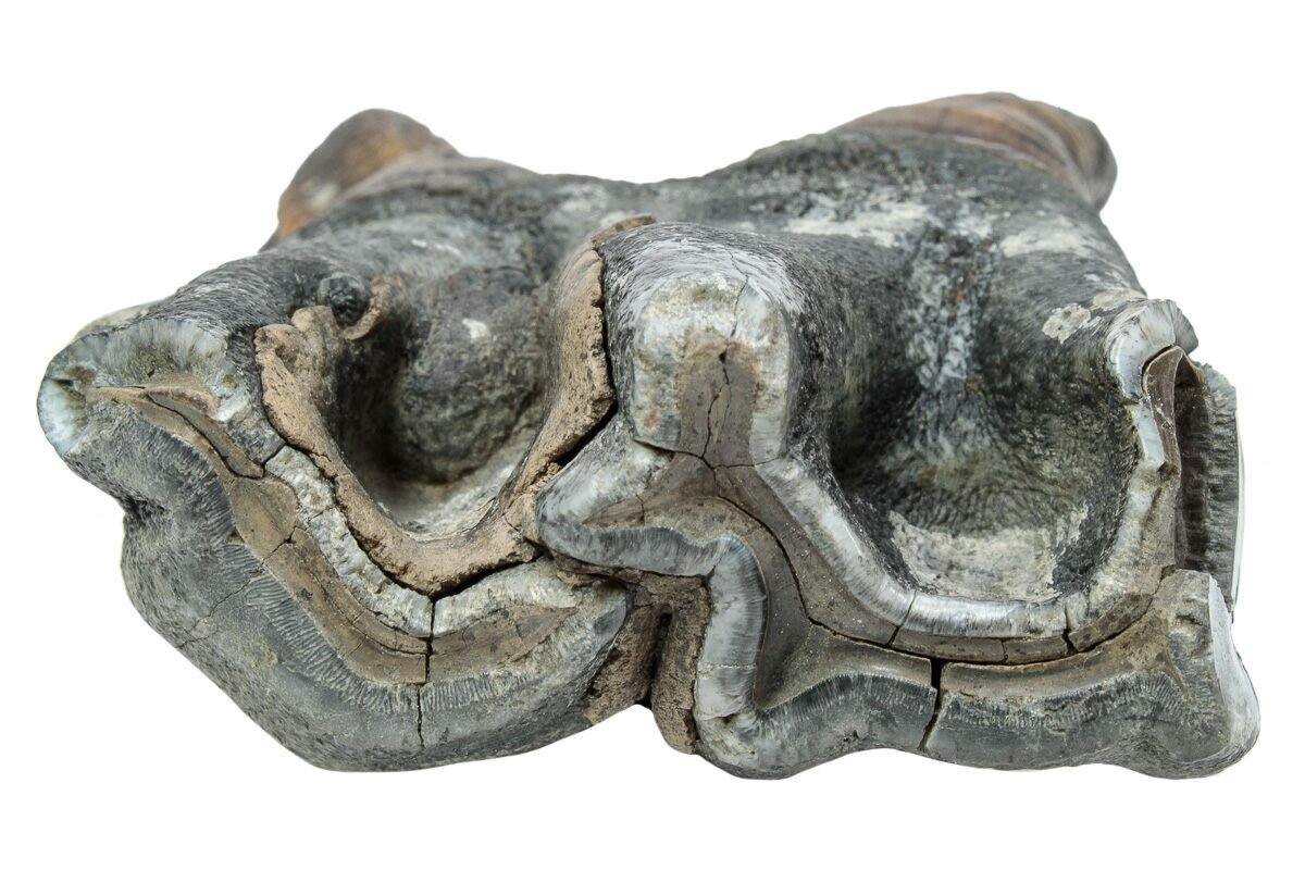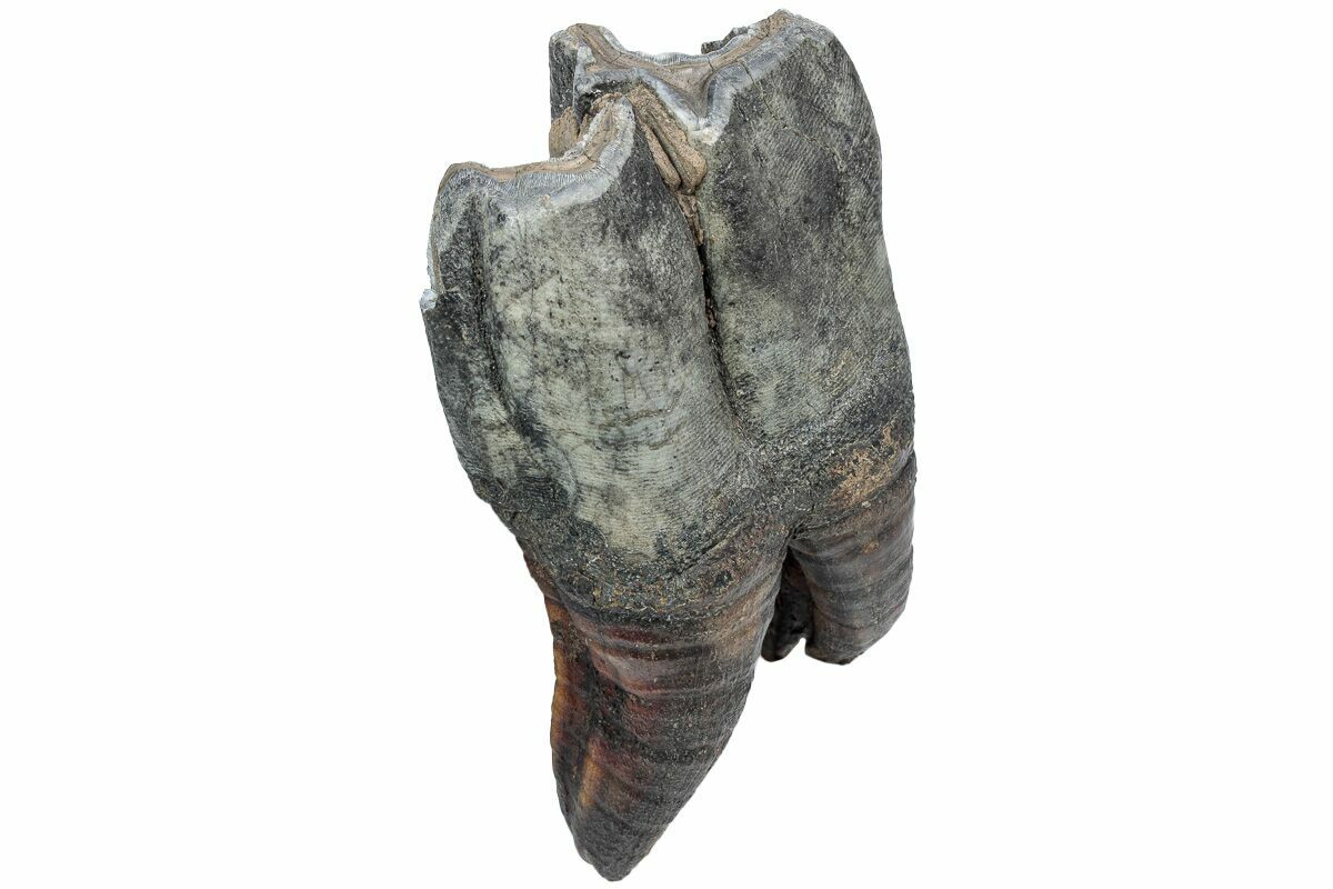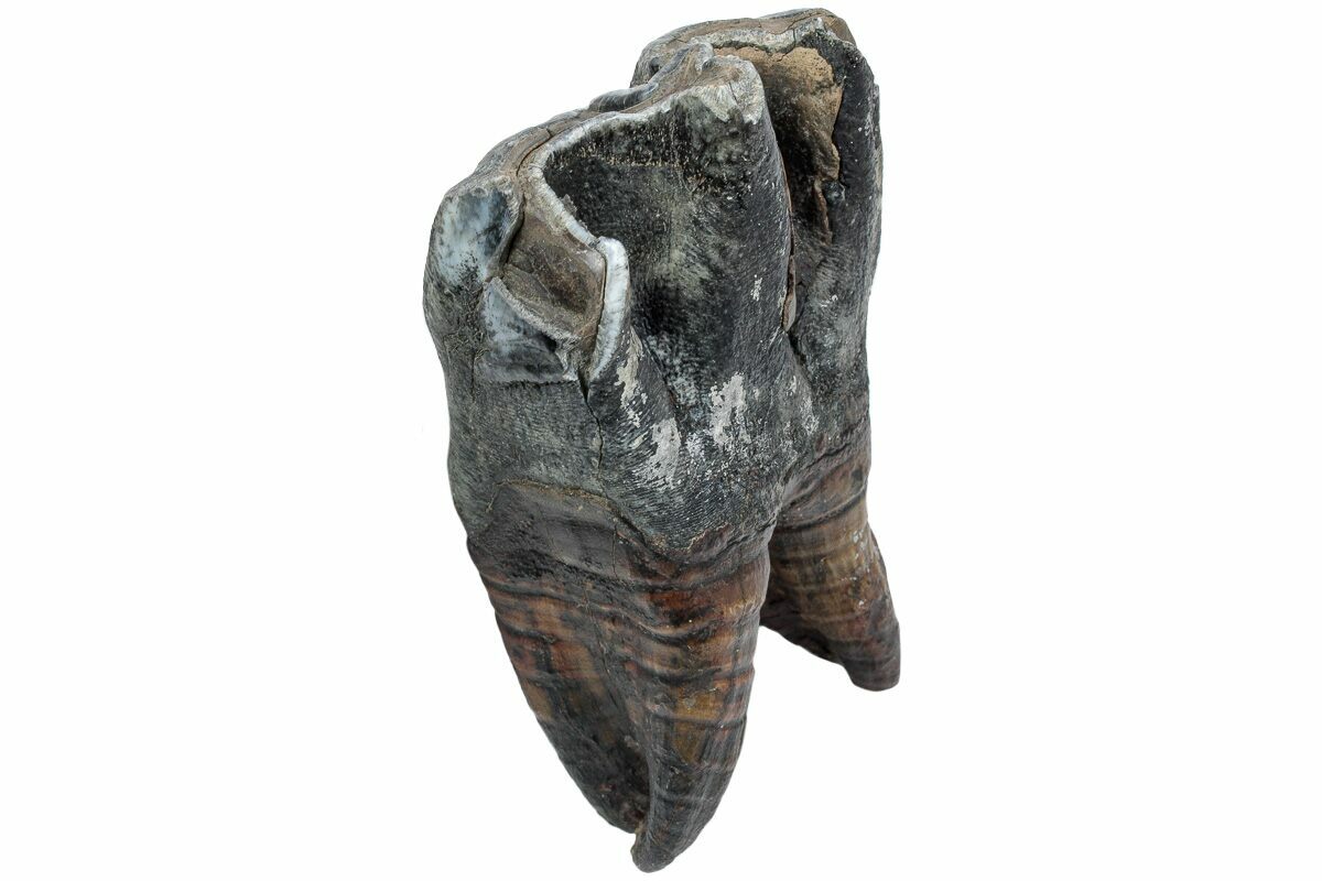 This is a well preserved fossil tooth from a woolly rhinoceros (Coelodonta antiquitatis). The enamel is very well preserved, with black-gray tones coating most of the crown. This fossil comes from Siberia, Russia, where many Woolly Mammoth and Rhino fossils are unearthed. The tooth is mostly complete and has most of its root intact. Including the root, the tooth measures 4.4" tall.