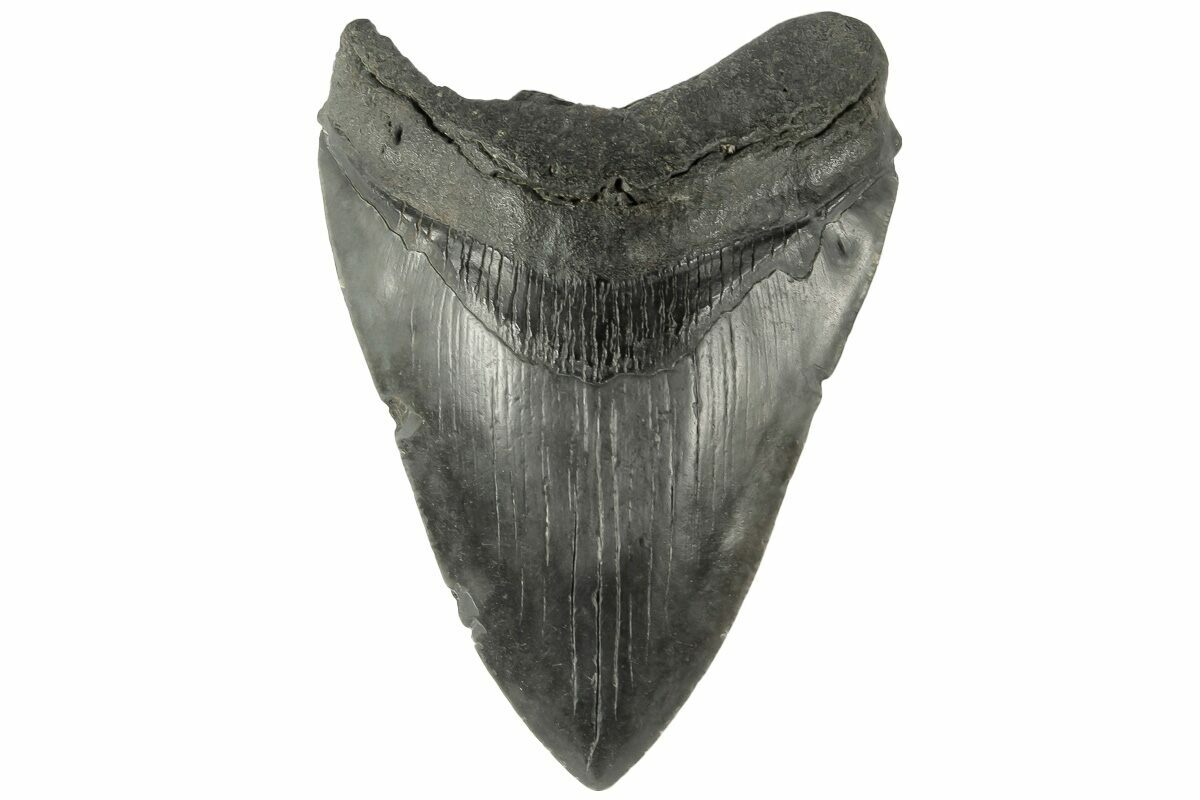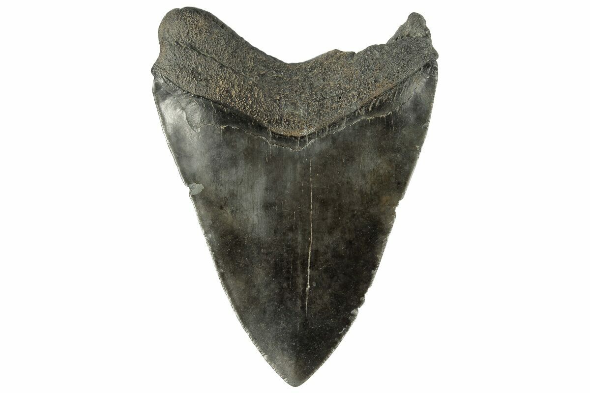 The standard measure for megalodon teeth is slant height, or the longest edge of the tooth. Adult megalodon teeth were typically in the 4 to 5 inch range: teeth over 6 inches are rare and represent super-sized individuals. Only a handful of teeth have ever been found over seven inches.