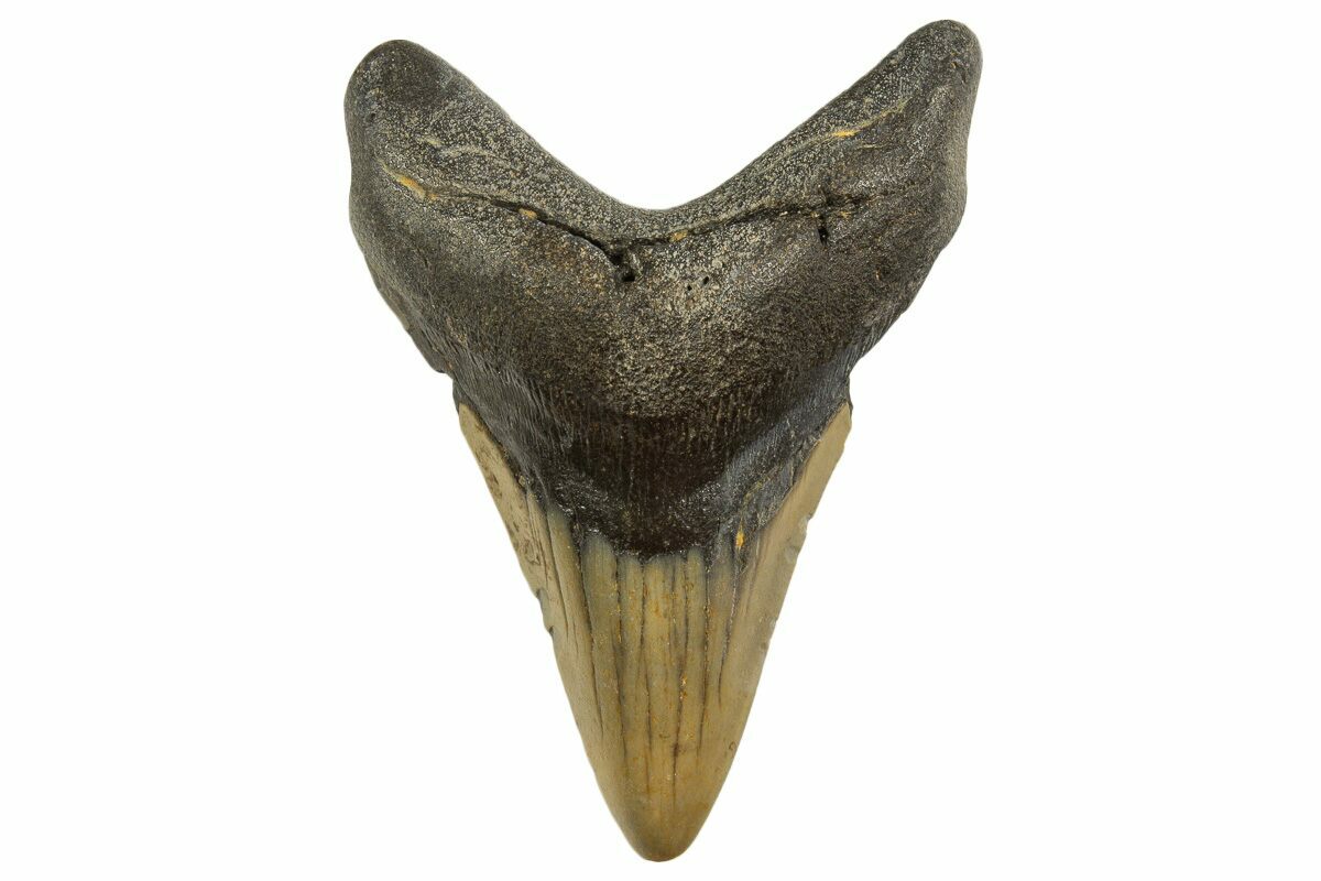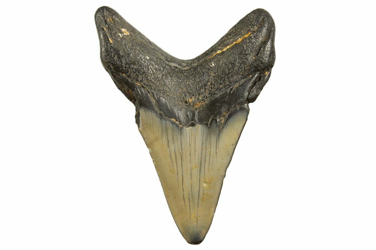 This is a 4.41" long megalodon tooth collected on the North Carolina coast. It was found by commercial divers collecting "the ledges" in about 100 feet of water. It would have eroded out of the Pungo River Formation, putting its age in the range of 13.8 to 16 million years old. A tooth of this size would have come from a prehistoric, mega-shark in the 35+ foot size range.