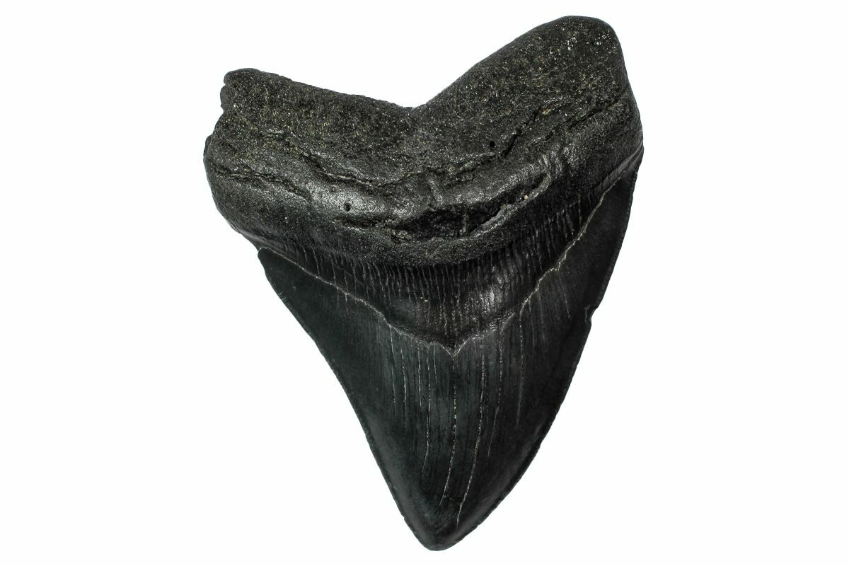 The standard measure for megalodon teeth is slant height, or the longest edge of the tooth. Adult megalodon teeth were typically in the 4 to 5 inch range: teeth over 6 inches are rare and represent super-sized individuals. Only a handful of teeth have ever been found over seven inches.