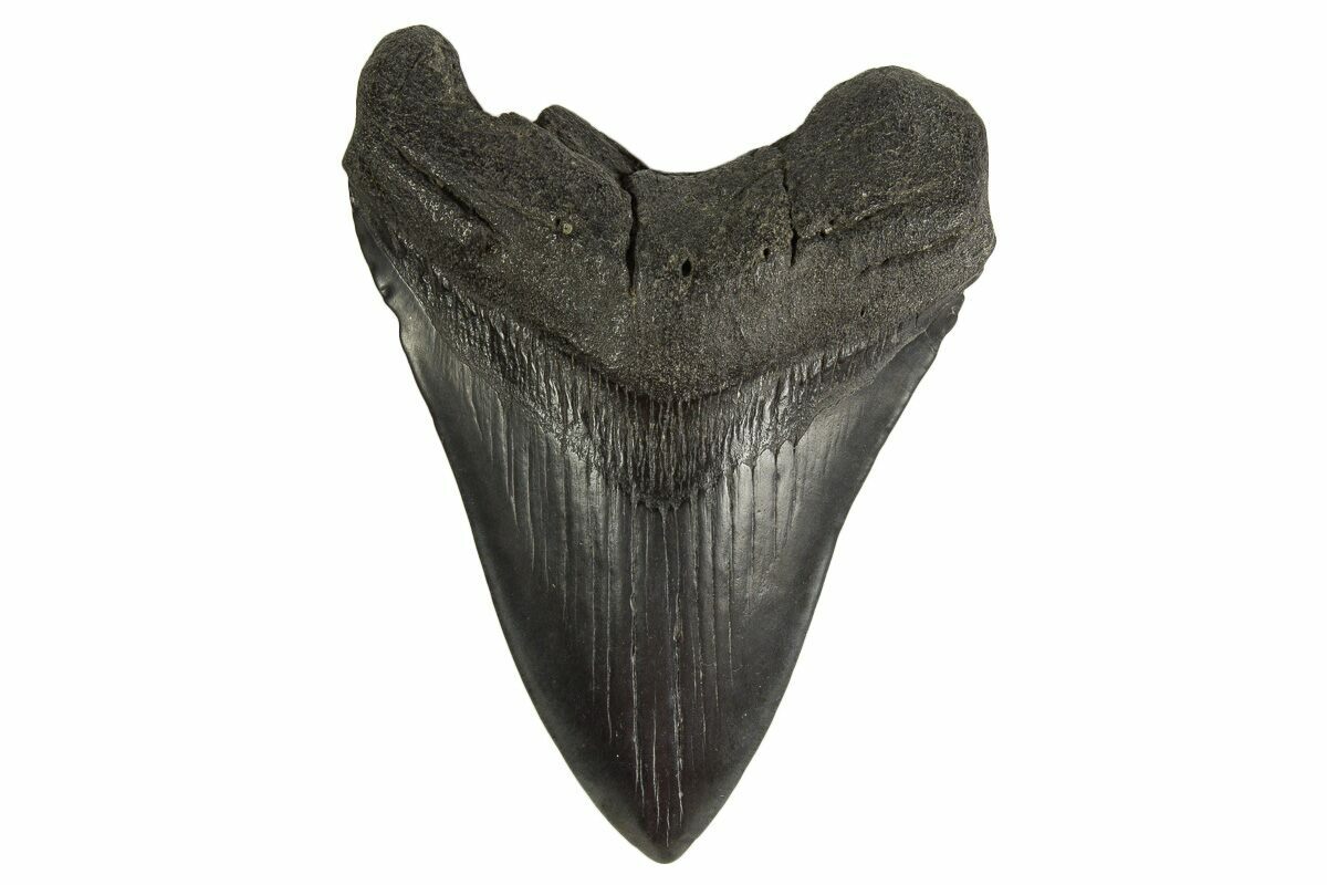 The standard measure for megalodon teeth is slant height, or the longest edge of the tooth. Adult megalodon teeth were typically in the 4 to 5 inch range: teeth over 6 inches are rare and represent super-sized individuals. Only a handful of teeth have ever been found over seven inches.