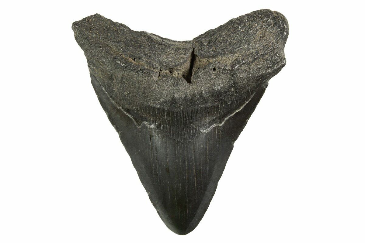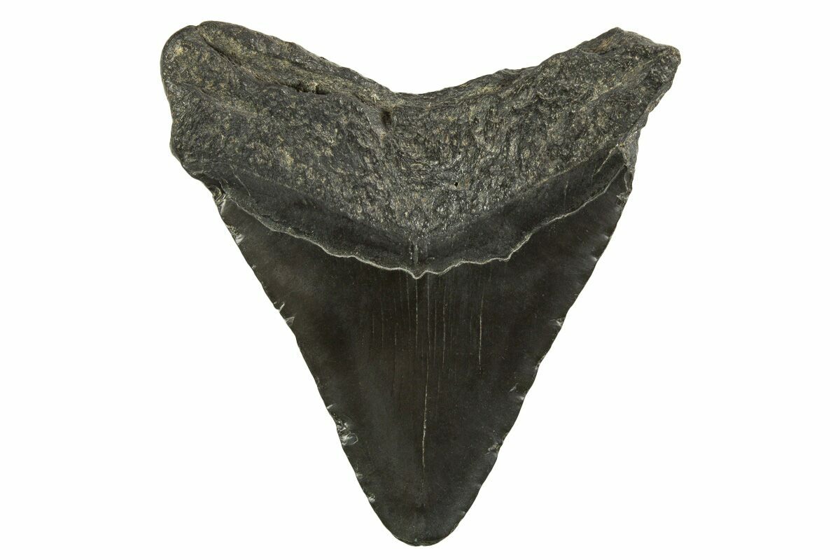 This is a 4.46" long fossil megalodon tooth collected in South Carolina. A tooth of this size would have come from a prehistoric, mega-shark in the 30+ foot size range.