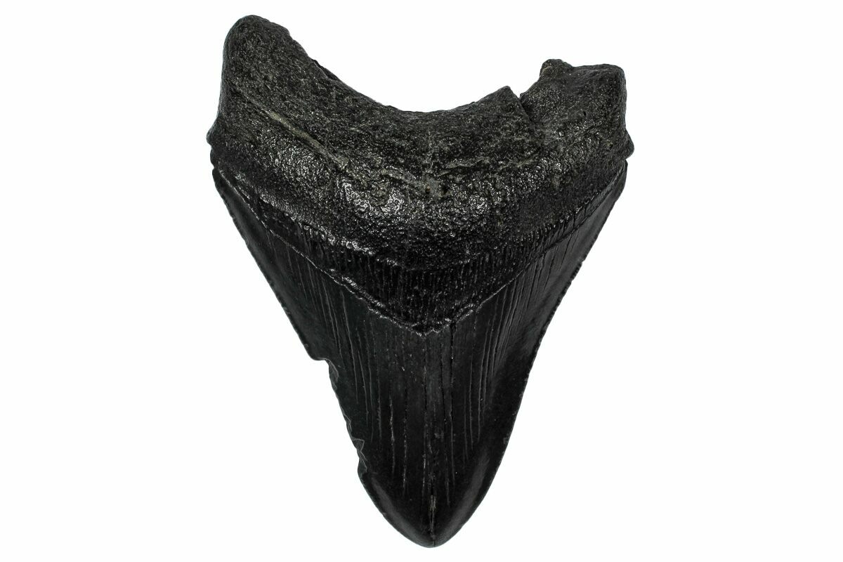 This is a 4.48" long, fossil megalodon tooth collected in South Carolina. The tooth would have come from an adult, prehistoric, mega-shark in the 35+ foot size range.