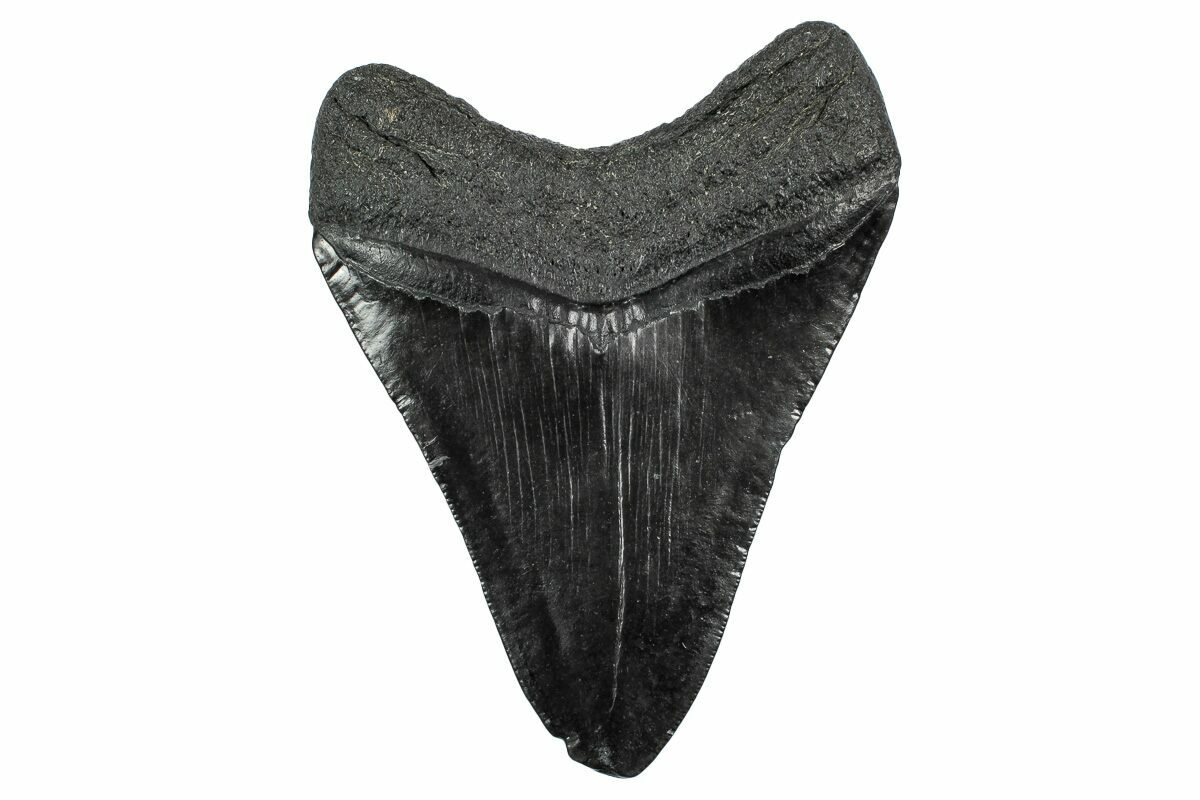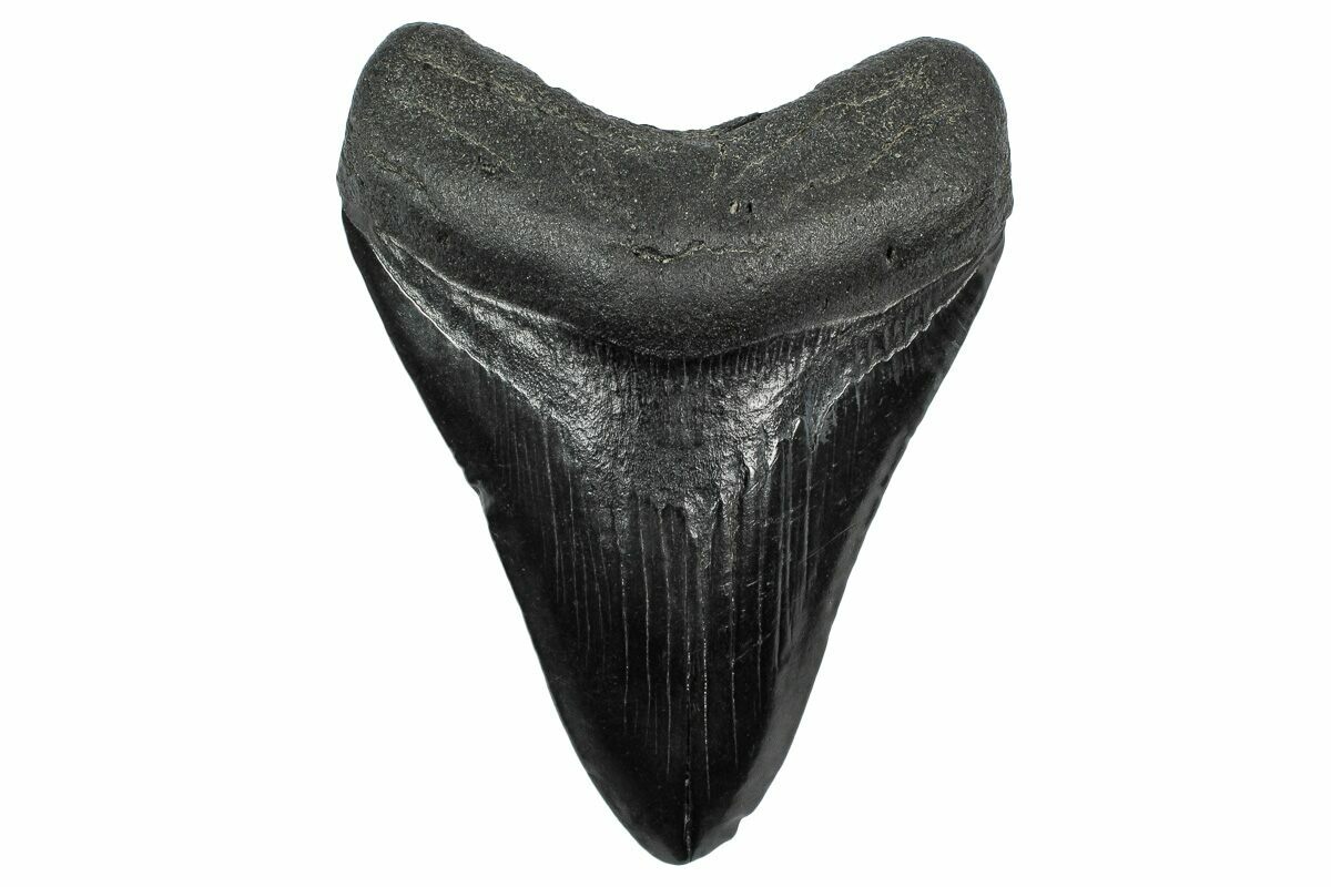 The standard measure for megalodon teeth is slant height, or the longest edge of the tooth. Adult megalodon teeth were typically in the 4 to 5 inch range: teeth over 6 inches are rare and represent super-sized individuals. Only a handful of teeth have ever been found over seven inches.