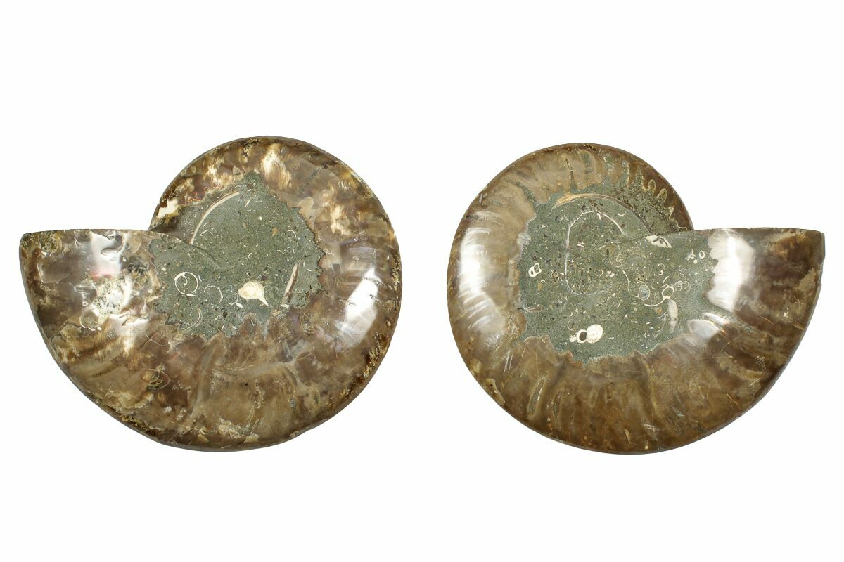 It exhibits gorgeous mineralization within the chambers, each separated by white calcite septa (divisions). This highly polished exotic ammonite makes a superb display piece with tremendous historical appeal.