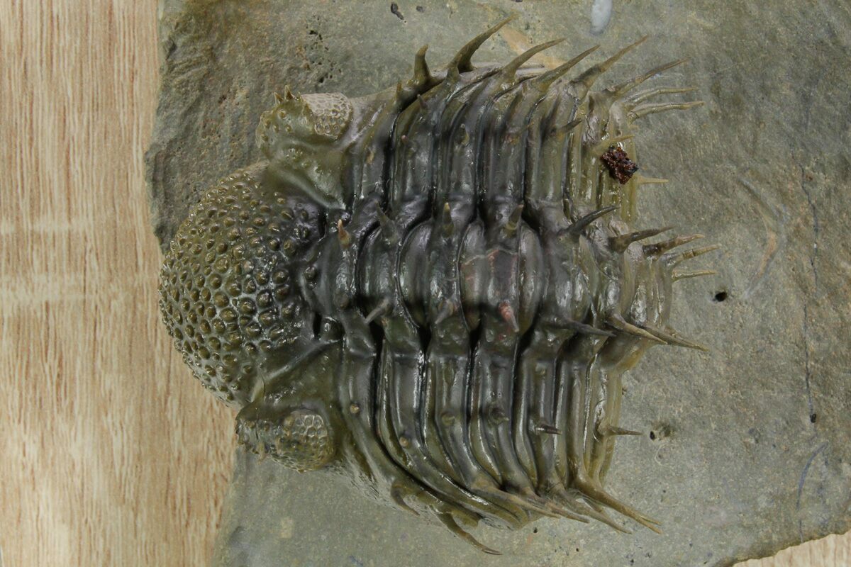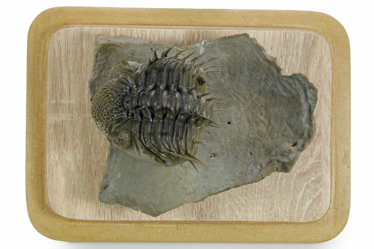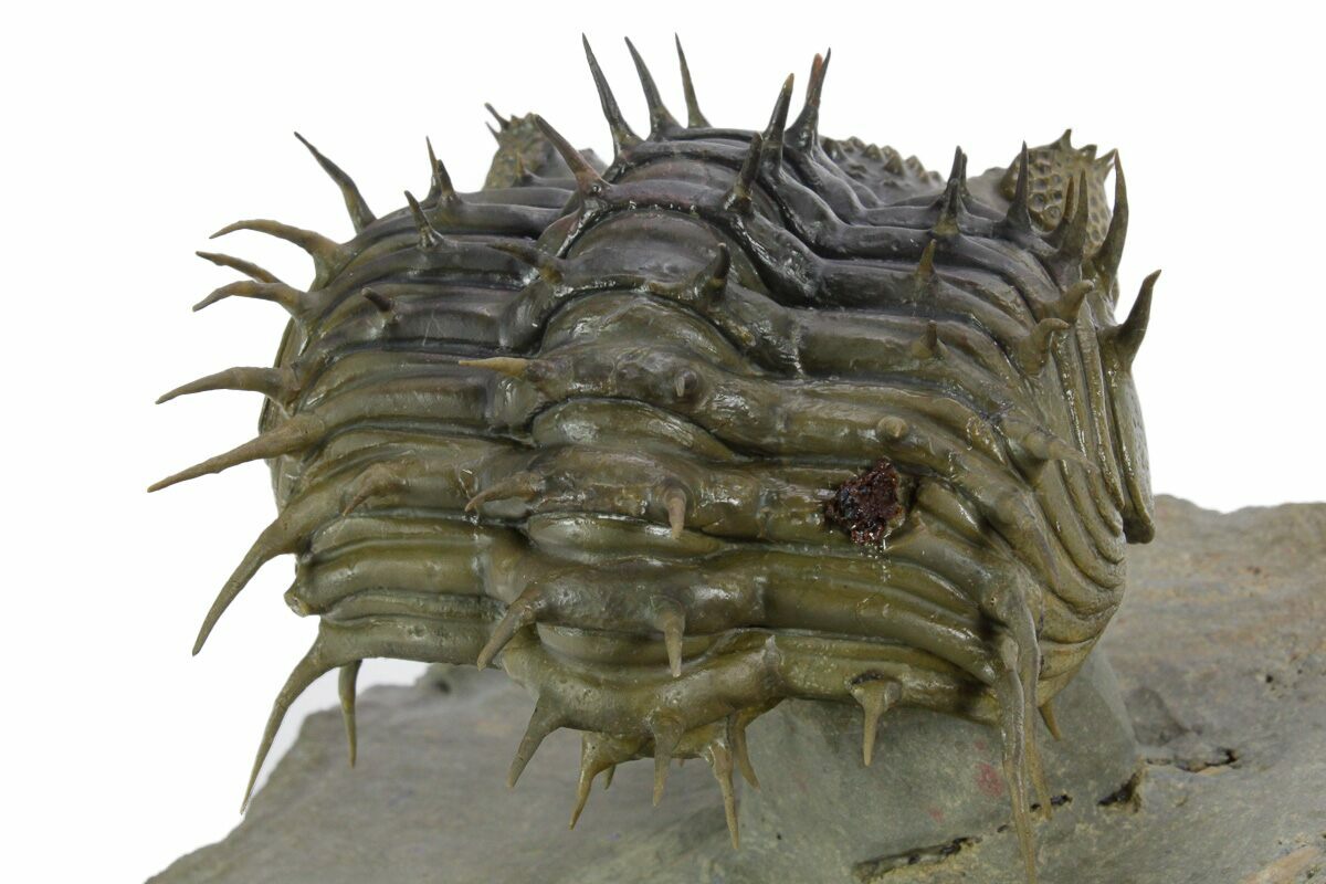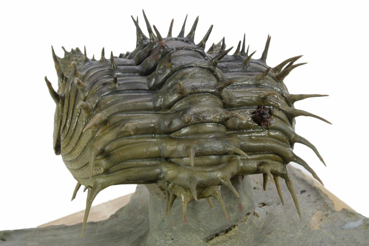 This is a super-spiny enrolled Drotops armatus trilobite which would be about 4.5" long if outstretched. It comes from the Bou Dib Formation near Issoumour, Morocco. It has been expertly prepared to remove the hard surrounding limestone and leave it perched on a pedestal of rock. Unlike most D. armatus on the market all of the spines are original and it only has one small spot of restoration, less than 1%