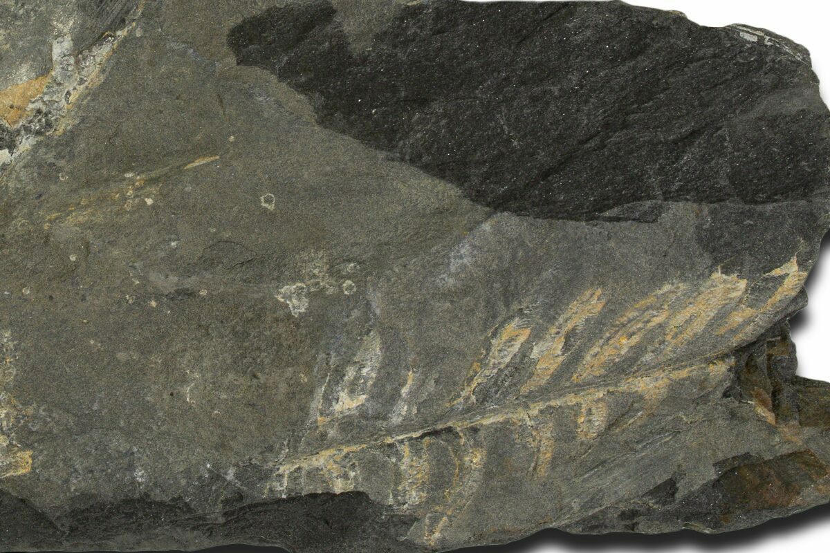 These plants were buried in a swamp where a low temperature, low pressure, and low oxygen environment caused the plant tissue to be slowly replaced by pyrite. This pyrite was later replaced by a whitish mineral (aluminum silicate) as the fossils were buried and exposed to the heat and pressure inside of the earth. The majority of the ferns on this plate are of the genus Alethopteris, though Pecopteris ferns can be seen from time to time.