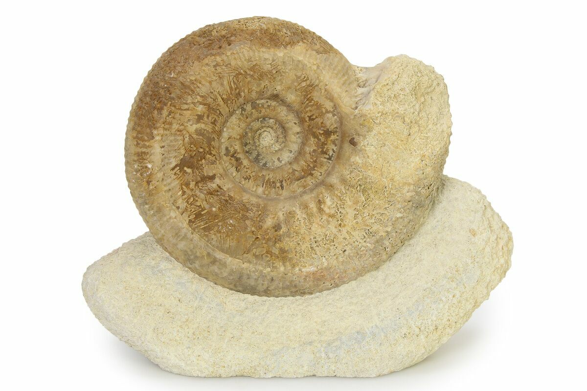 This is a 4.5" Stephanoceras humphresianum ammonite fossil from Dorset, England. It is Middle Jurassic in age, or approximately 168 million years old. The rock along one side of the specimen has been cut flat so that it stands up without the need for a display stand.