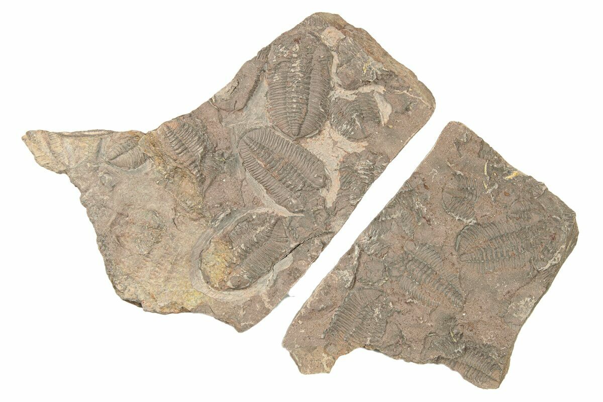 This is a 4.5 x 3.8" mortality plate of Ordovician trilobites from Tafraoute, Morocco. Both the positive and negative splits are included along with a pair of display stands.