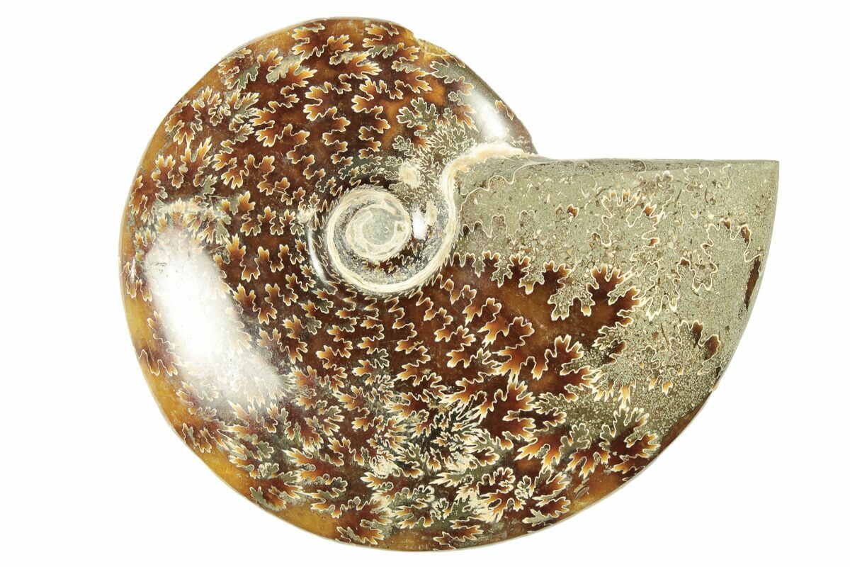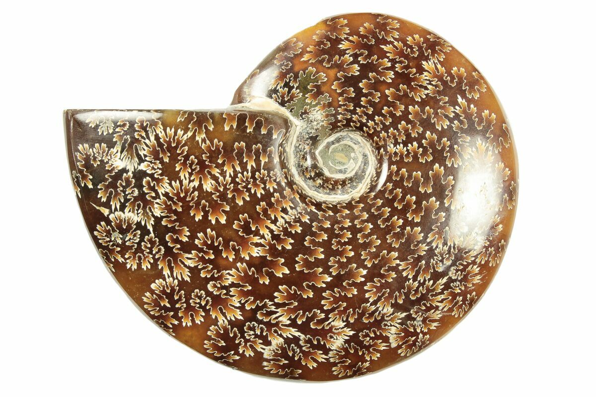 This is a 4.5" wide polished ammonite from Madagascar of the genus Cleoniceras. It is absolutely gorgeous, displaying a distinctive "oak-leaf" suture pattern on the surface. This 110 million year old ammonite is truly a natural work of art and is very displayable on the included acrylic stand.
