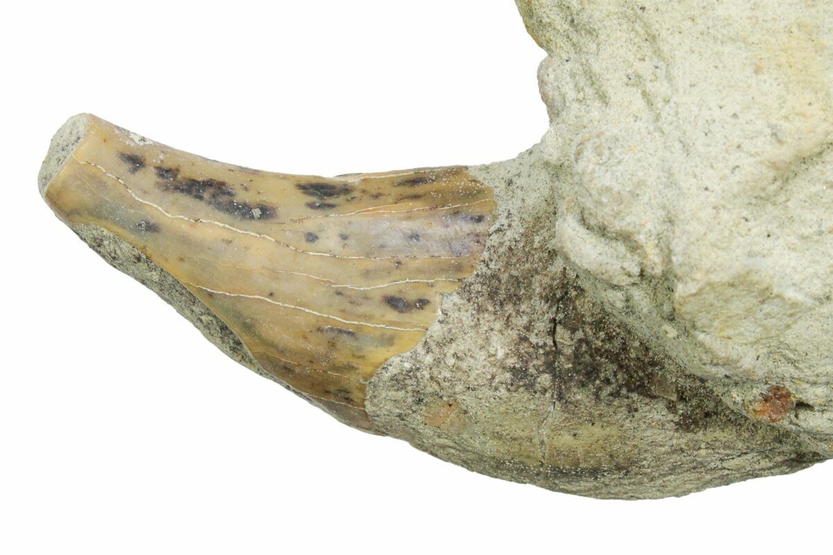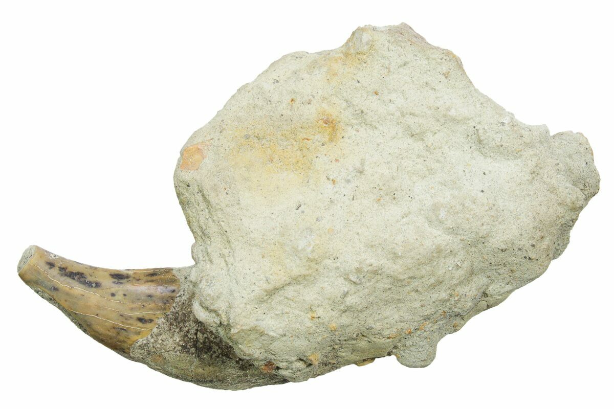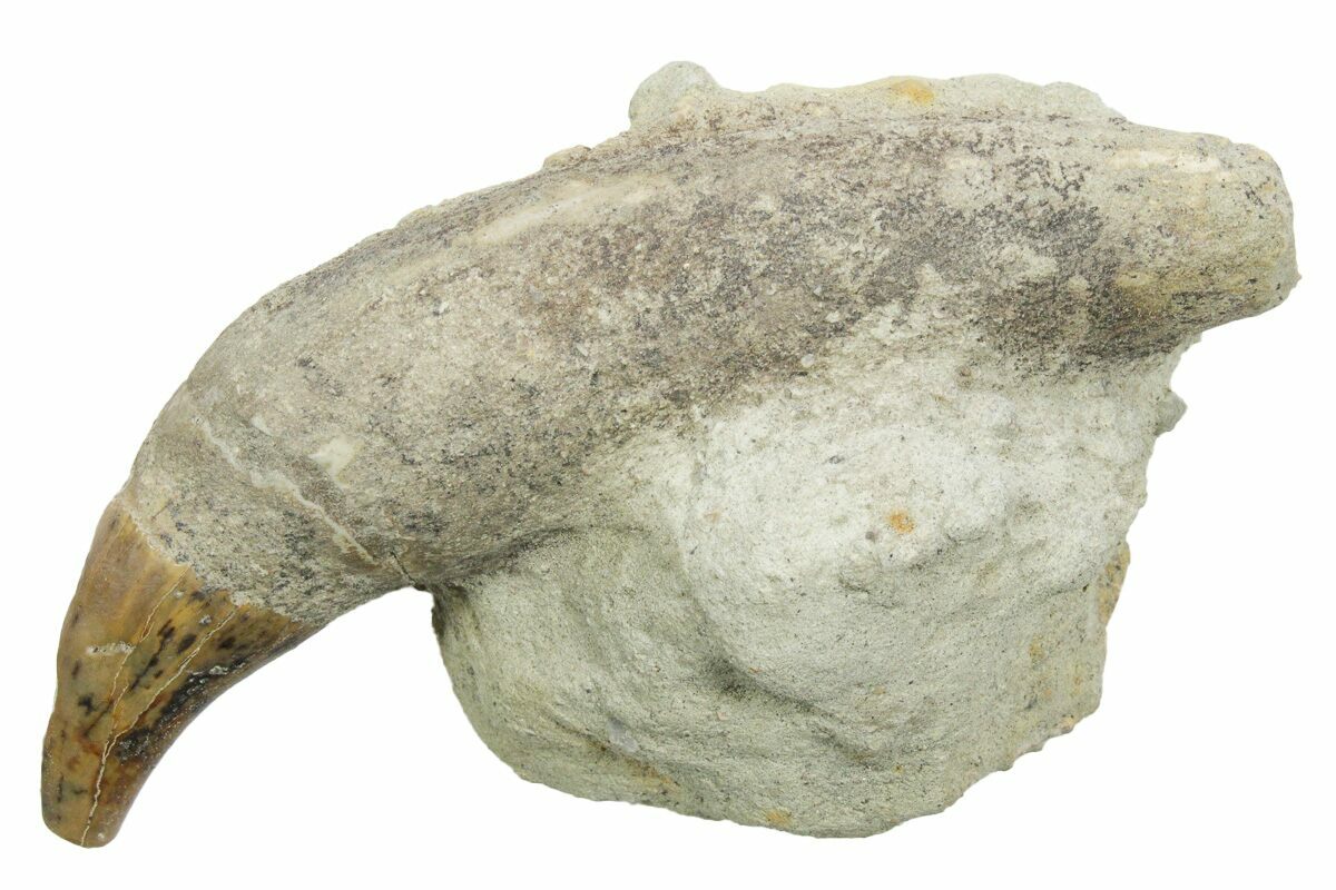 This is a 4.5" long, rooted fossil Sea Lion (Allodesmus kernensis) tooth from Sharktooth Hill near Bakersfield, CA. It is still partially embedded in the sandstone in which it was found.