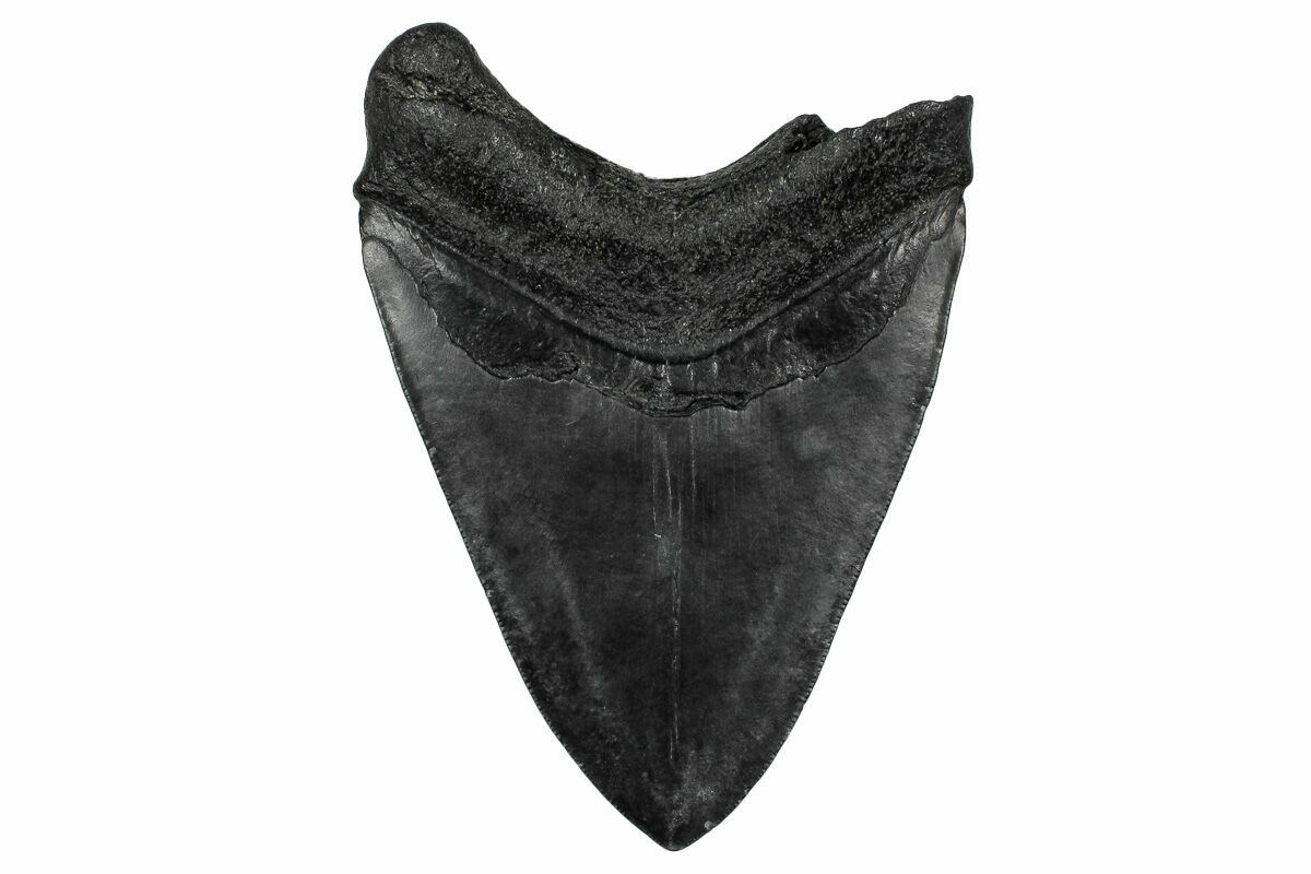 The standard measure for megalodon teeth is slant height, or the longest edge of the tooth. Adult megalodon teeth were typically in the 4 to 5 inch range: teeth over 6 inches are rare and represent super-sized individuals. Only a handful of teeth have ever been found over seven inches.