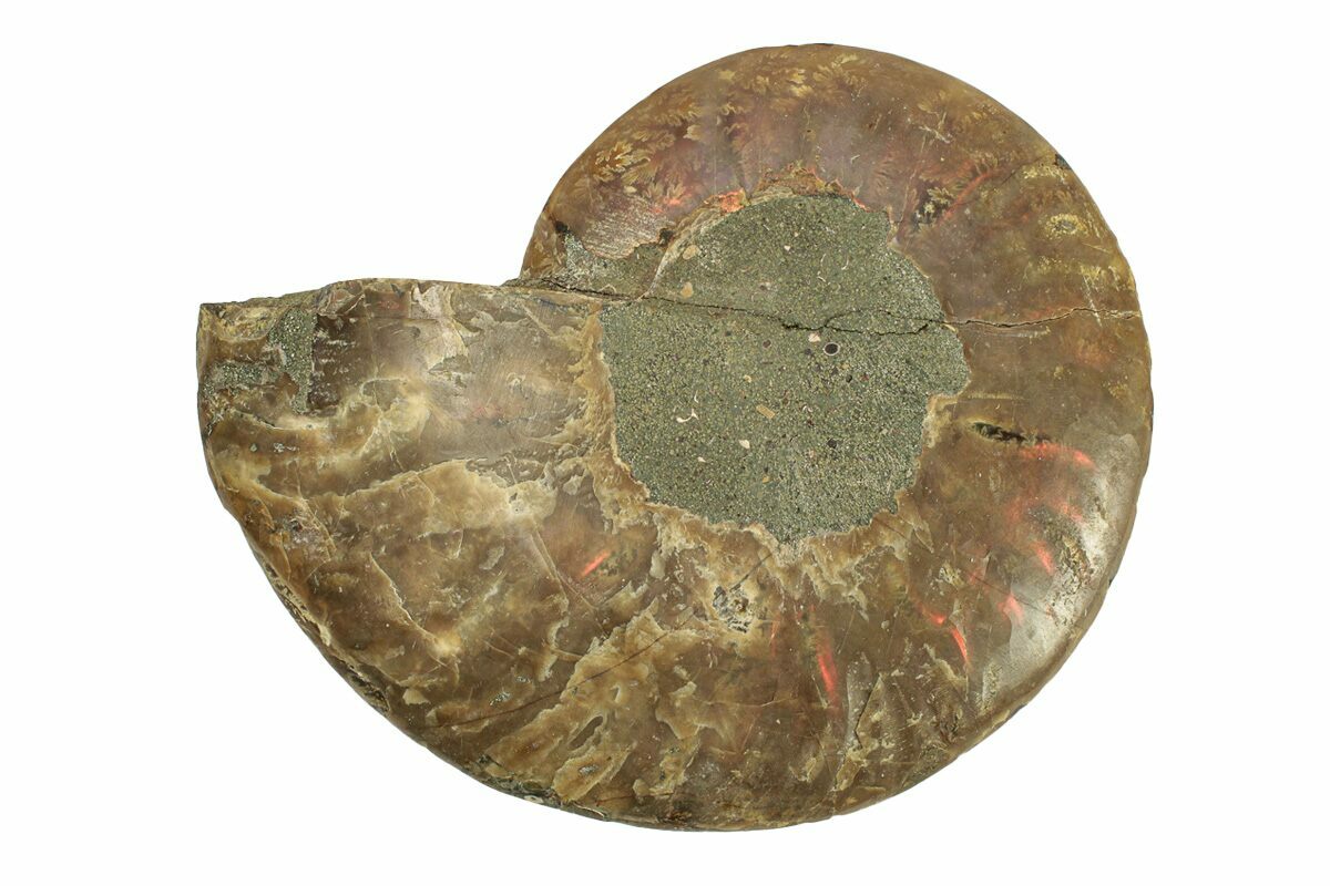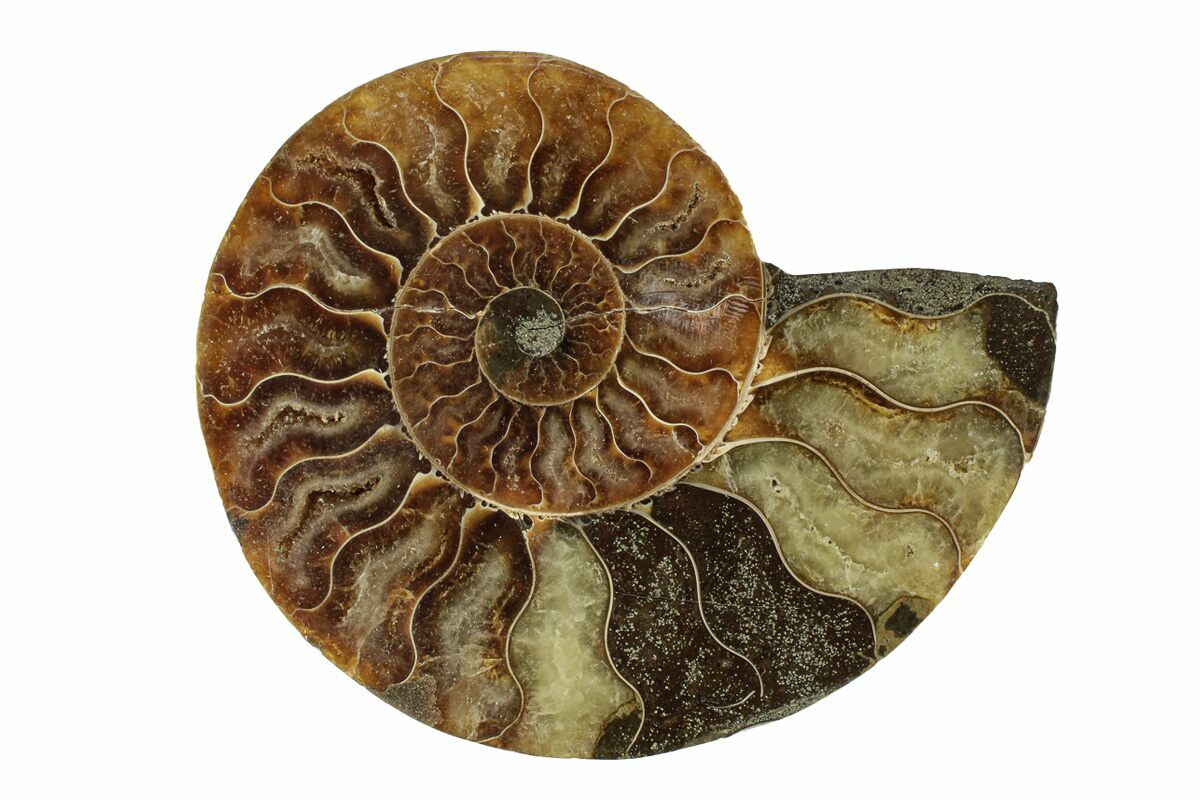 This specimen exhibits gorgeous mineralization within the chambers, each separated by white calcite septa (divisions). This highly polished, exotic ammonite makes a superb display piece with tremendous historical appeal.