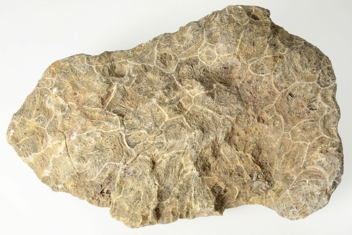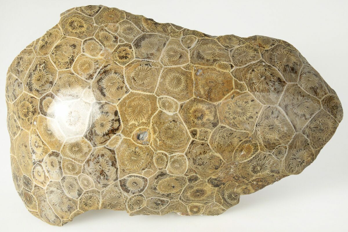 This is a beautiful piece of fossil coral collected near Assa Zag, Morocco in the Western Sahara. It is Early Pennsylvanian in age, or approximately 320 million years old. The polishing shows off the beautiful inner structure of the coral colony beautifully. It looks very similar to the fossil coral "Petoskey stones" found in Michigan, though these are a different genus of coral.