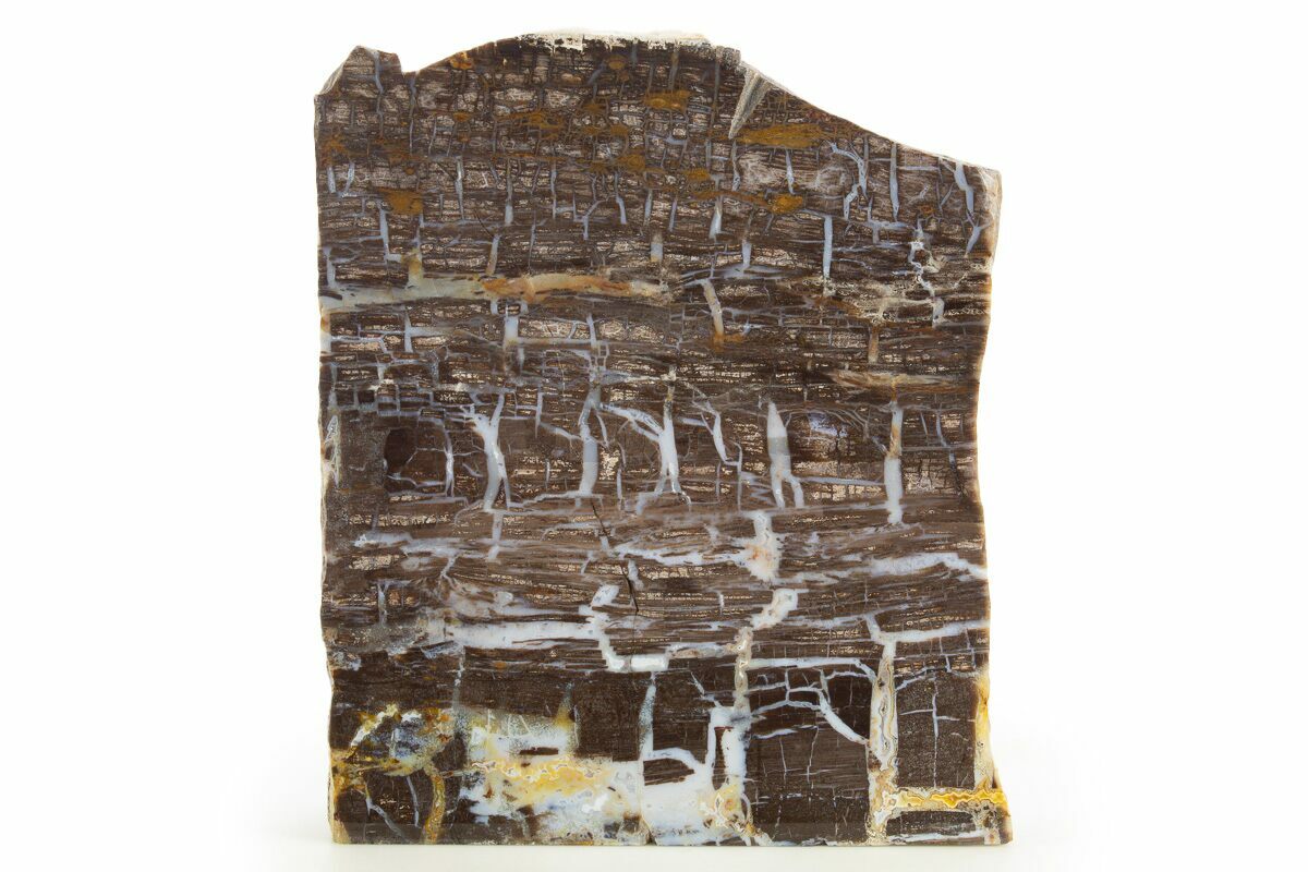 This is a colorful 4.55" tall stand-up of petrified shrinkwood that was collected from Parker, Colorado. The term "shrinkwood" refers to wood that following preservation, became fragmented, resulting in small cavities that become naturally "glued" back together by silica-rich fluids (chalcedony).